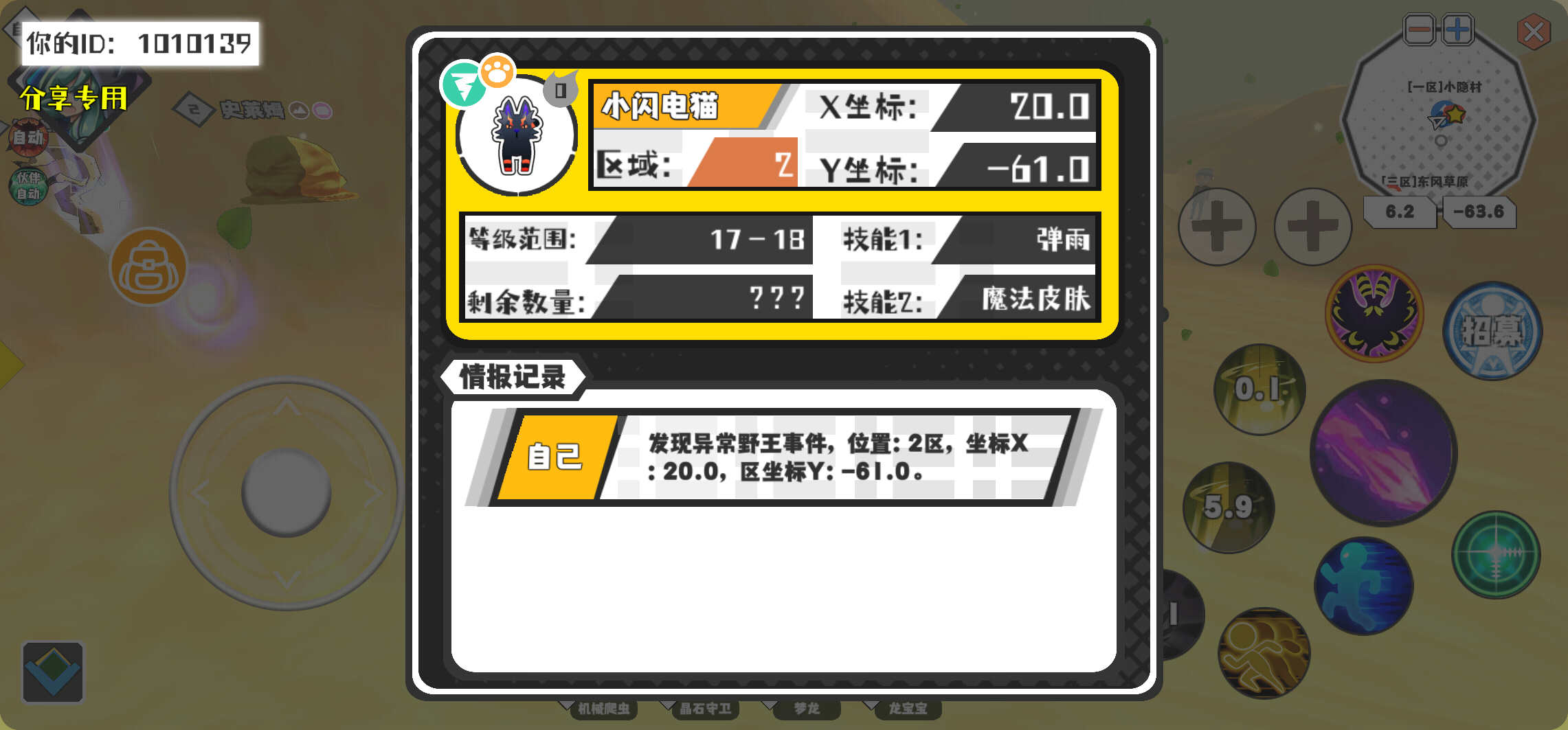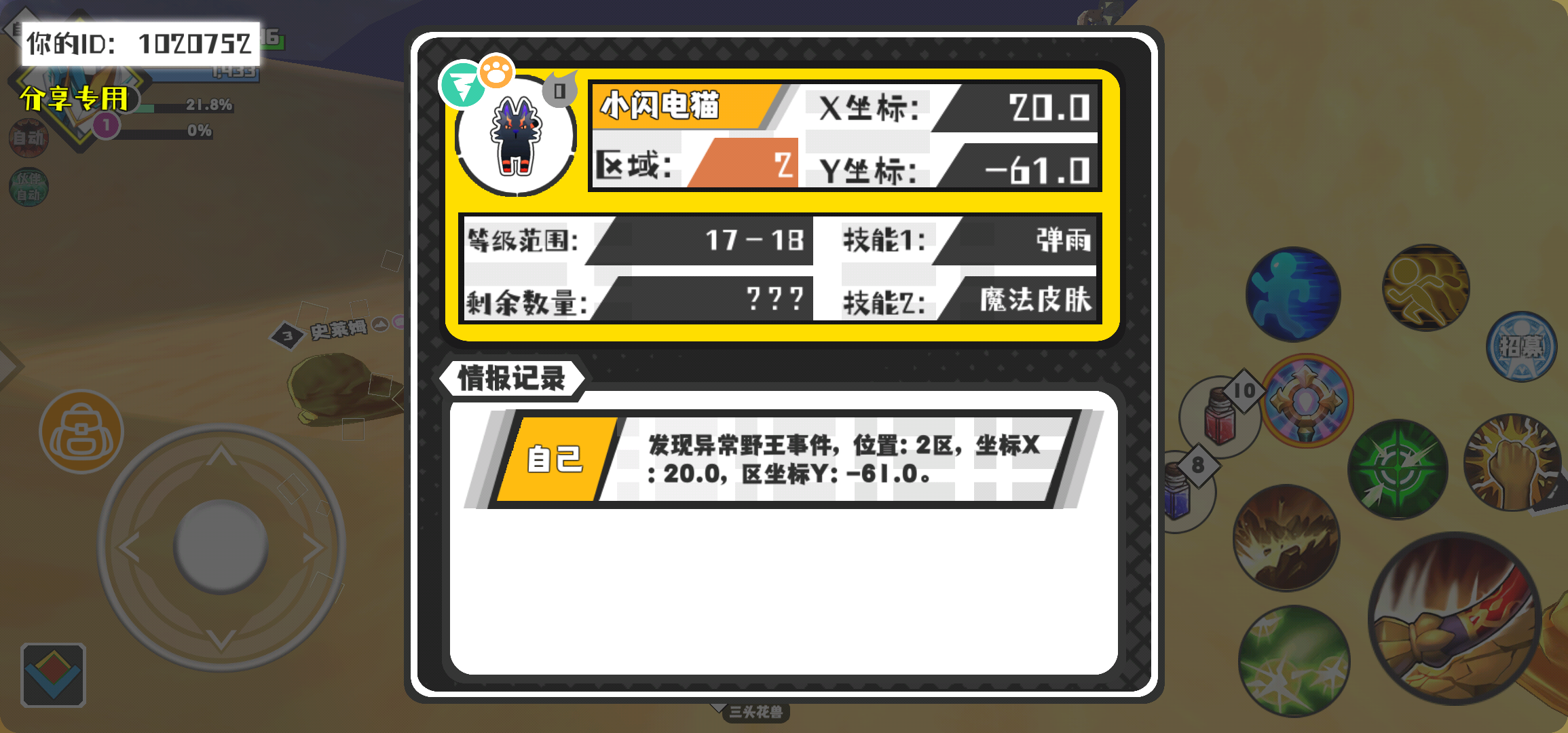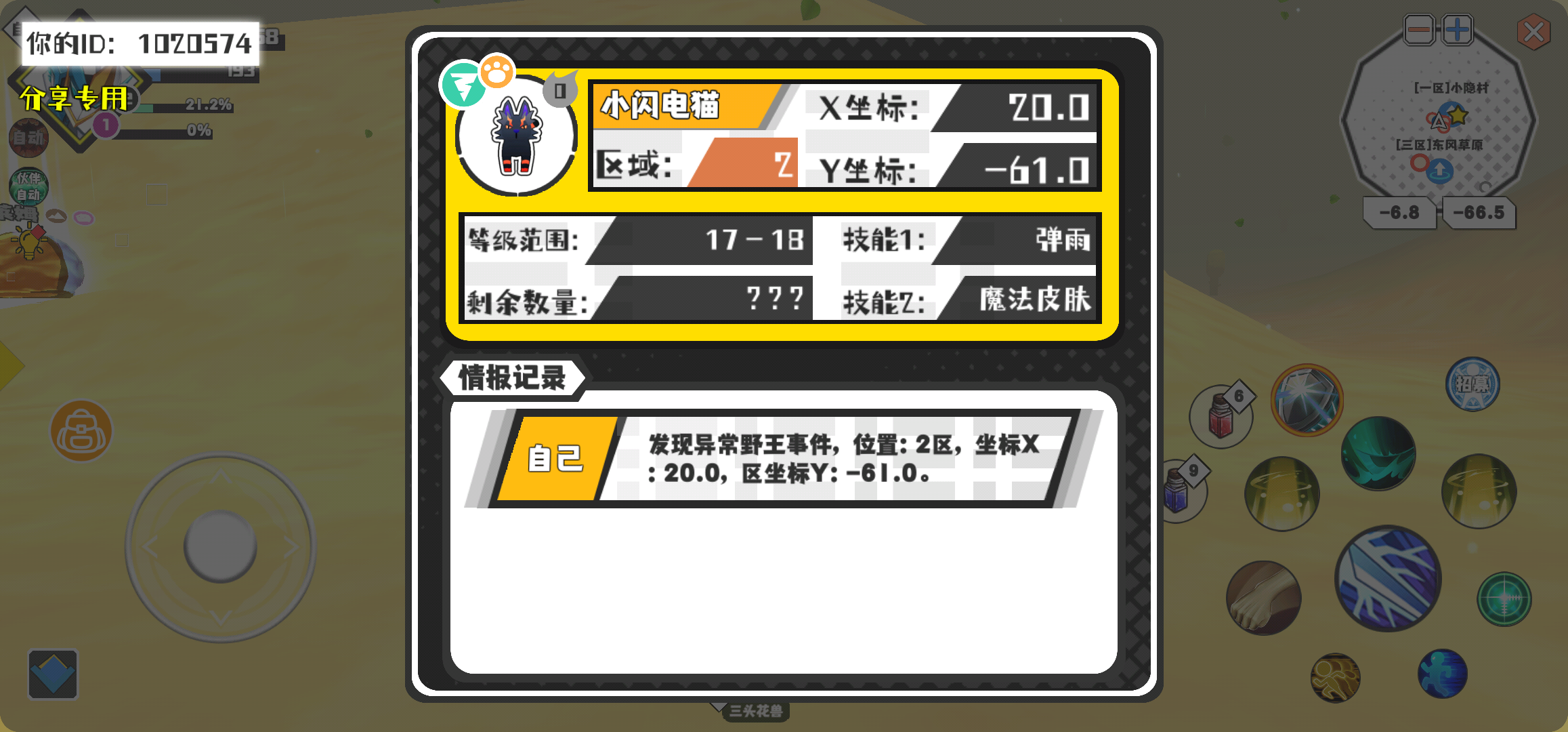 幸运时刻分享! 【野王异常出没】3月5日下午10点 - 小闪电猫【强度0】 【2区】 【X:20.0, Y:-61.0】