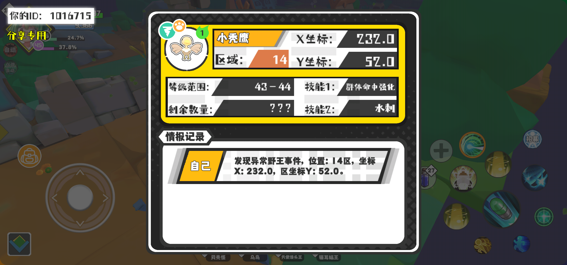 幸运时刻分享! 【野王异常出没】3月5日下午9点 - 小秃鹰【强度1】 【14区】 【X:232.0, Y:52.0】