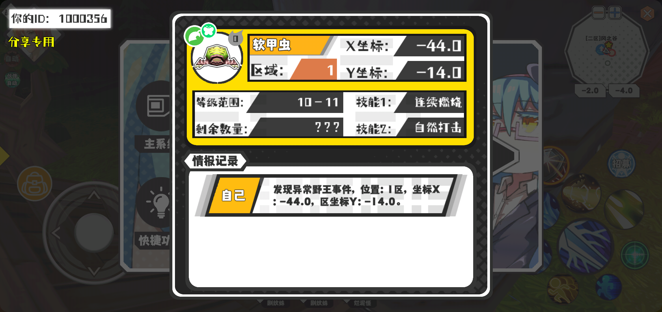 幸运时刻分享! 【野王异常出没】3月4日下午9点 - 软甲虫【强度0】 【1区】 【X:-44.0, Y:-14.0】