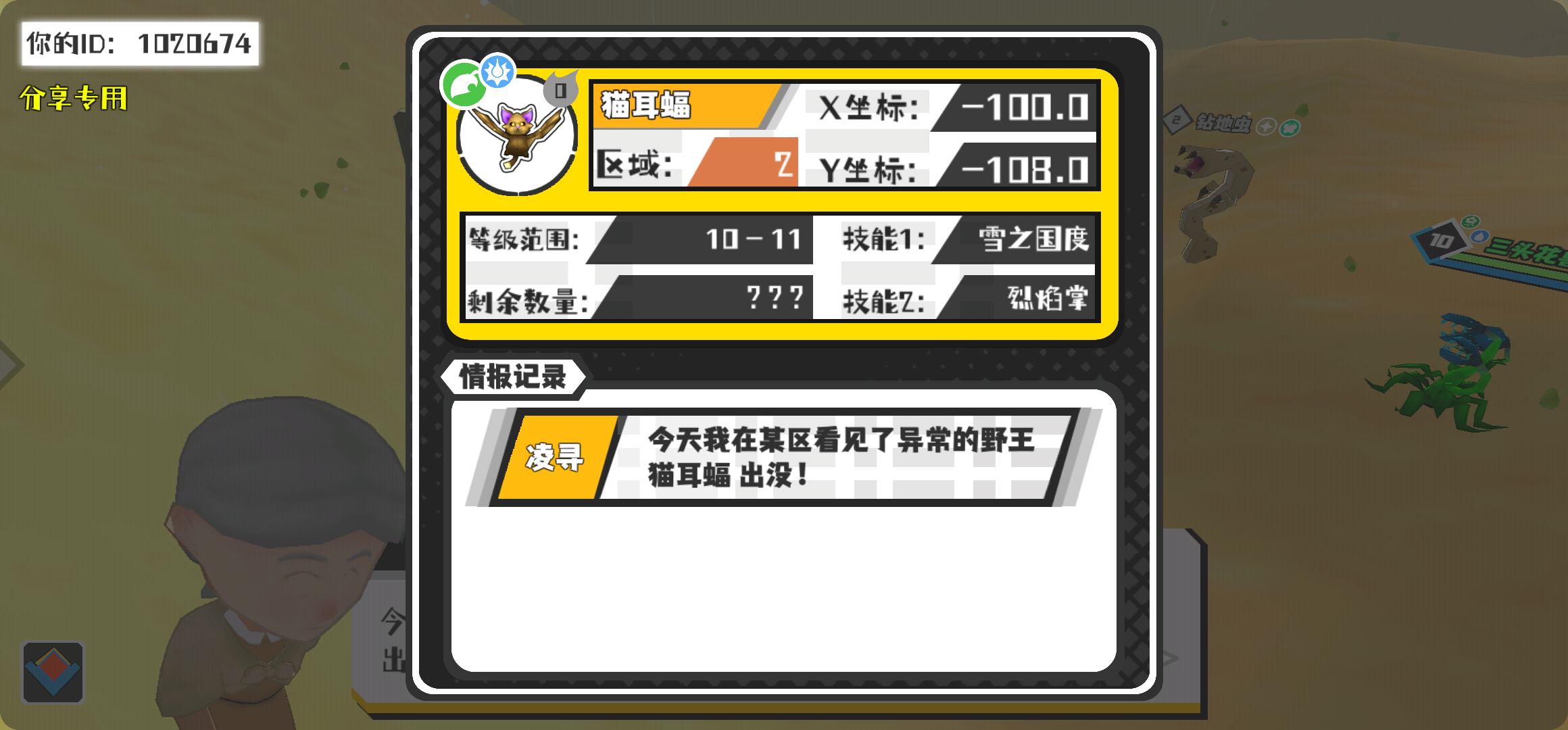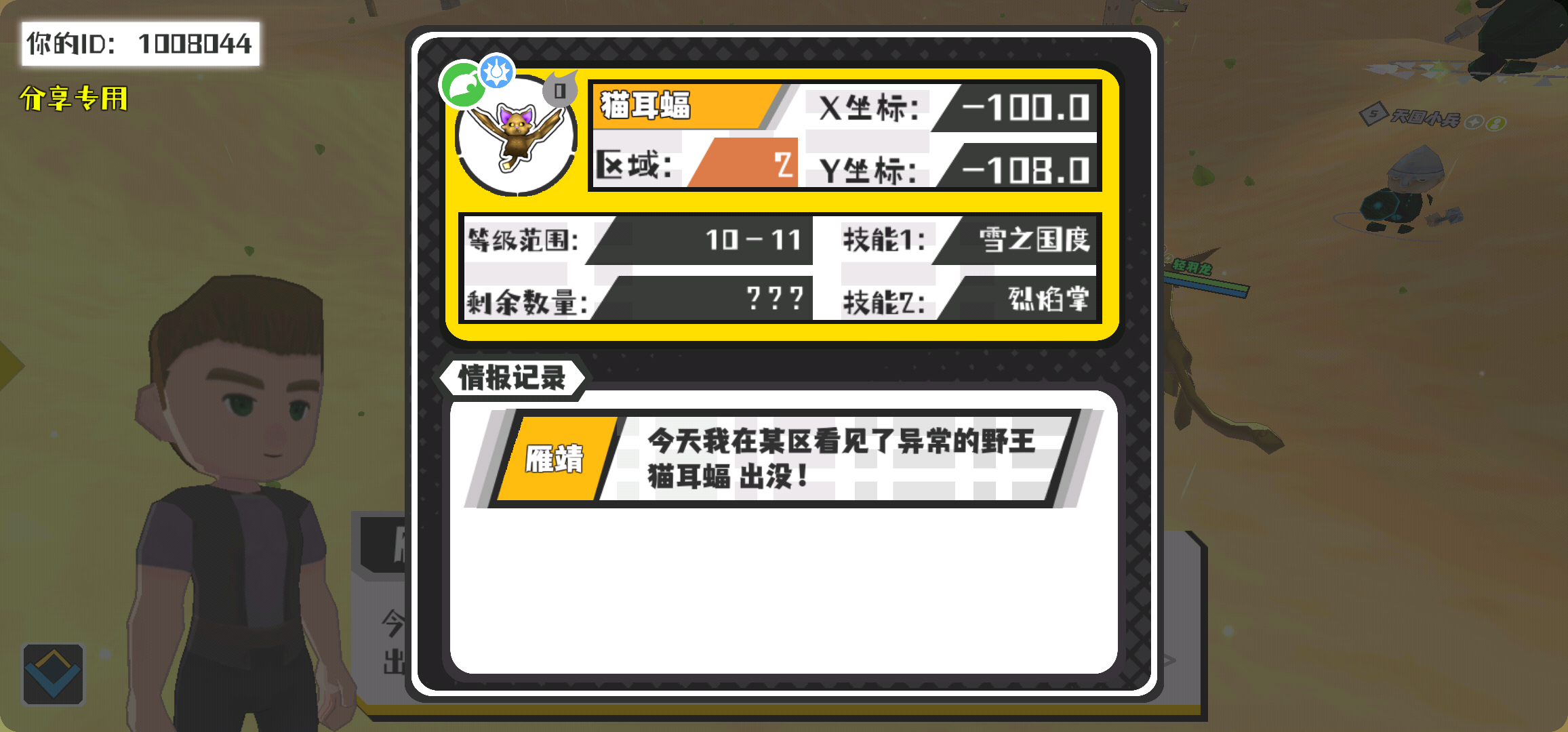 幸运时刻分享! 【野王异常出没】3月4日下午11点 - 猫耳蝠【强度0】 【2区】 【X:-100.0, Y:-108.0】
