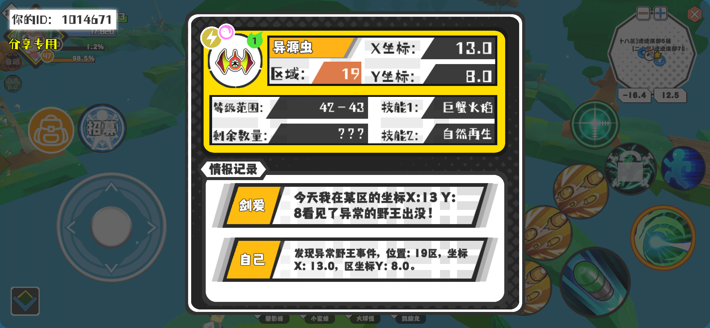 幸运时刻分享! 【野王异常出没】3月4日下午10点 - 异源虫【强度1】 【19区】 【X:13.0, Y:8.0】