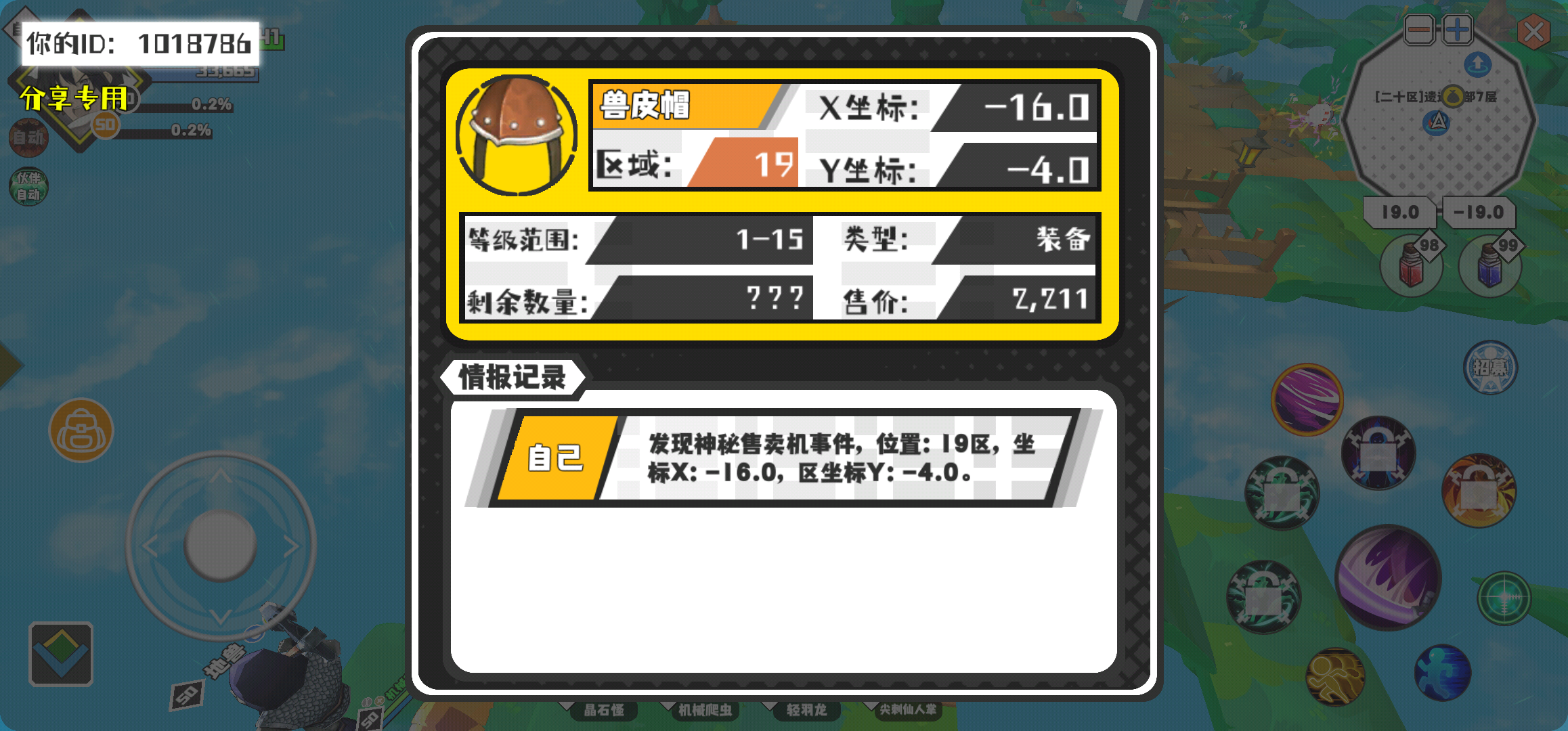 幸运时刻分享! 【神秘售卖机】3月2日下午8点 - 兽皮帽【1-15级 】【稀有度:神秘】 【19区】 【X:-16.0, Y:-4.0】