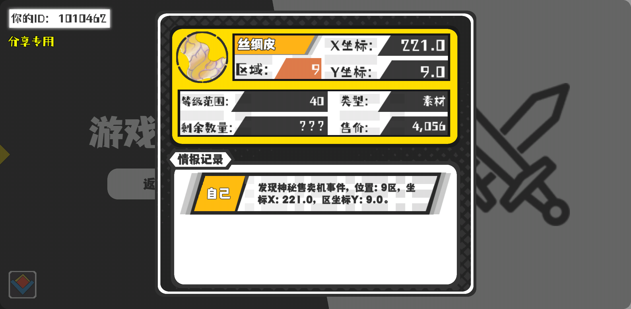 幸运时刻分享! 【神秘售卖机】3月2日下午7点 - 丝绸皮【40级 】【稀有度:精良】 【9区】 【X:221.0, Y:9.0】