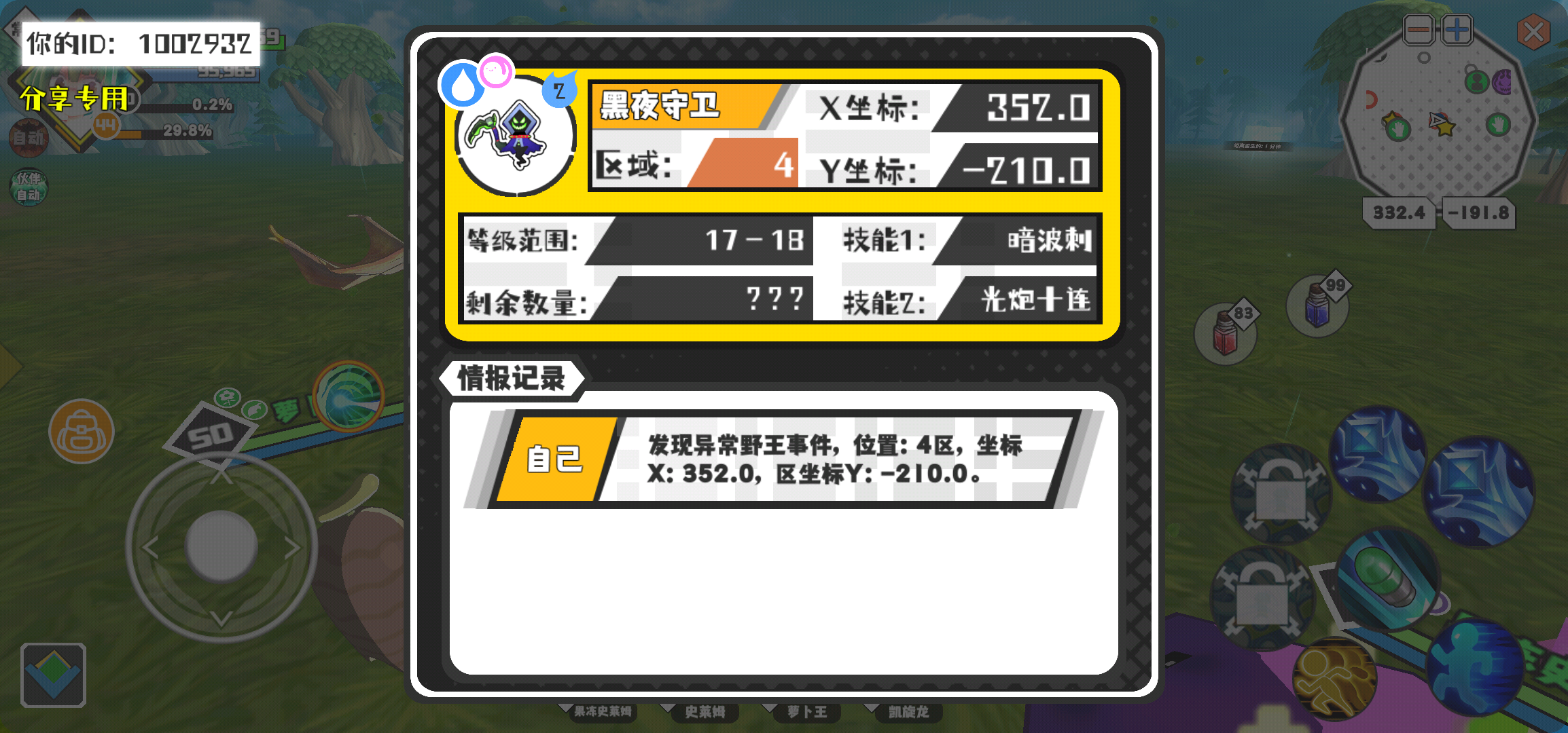 幸运时刻分享! 【野王异常出没】2月29日下午1点 - 黑夜守卫【强度2】 【4区】 【X:352.0, Y:-210.0】