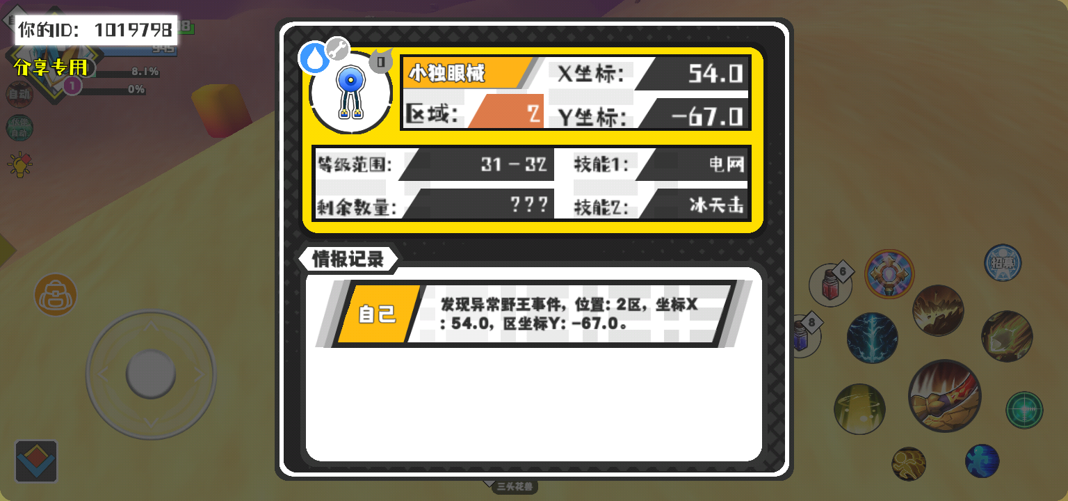 幸运时刻分享! 【野王异常出没】2月26日上午12点 - 小独眼械【强度0】 【2区】 【X:54.0, Y:-67.0】