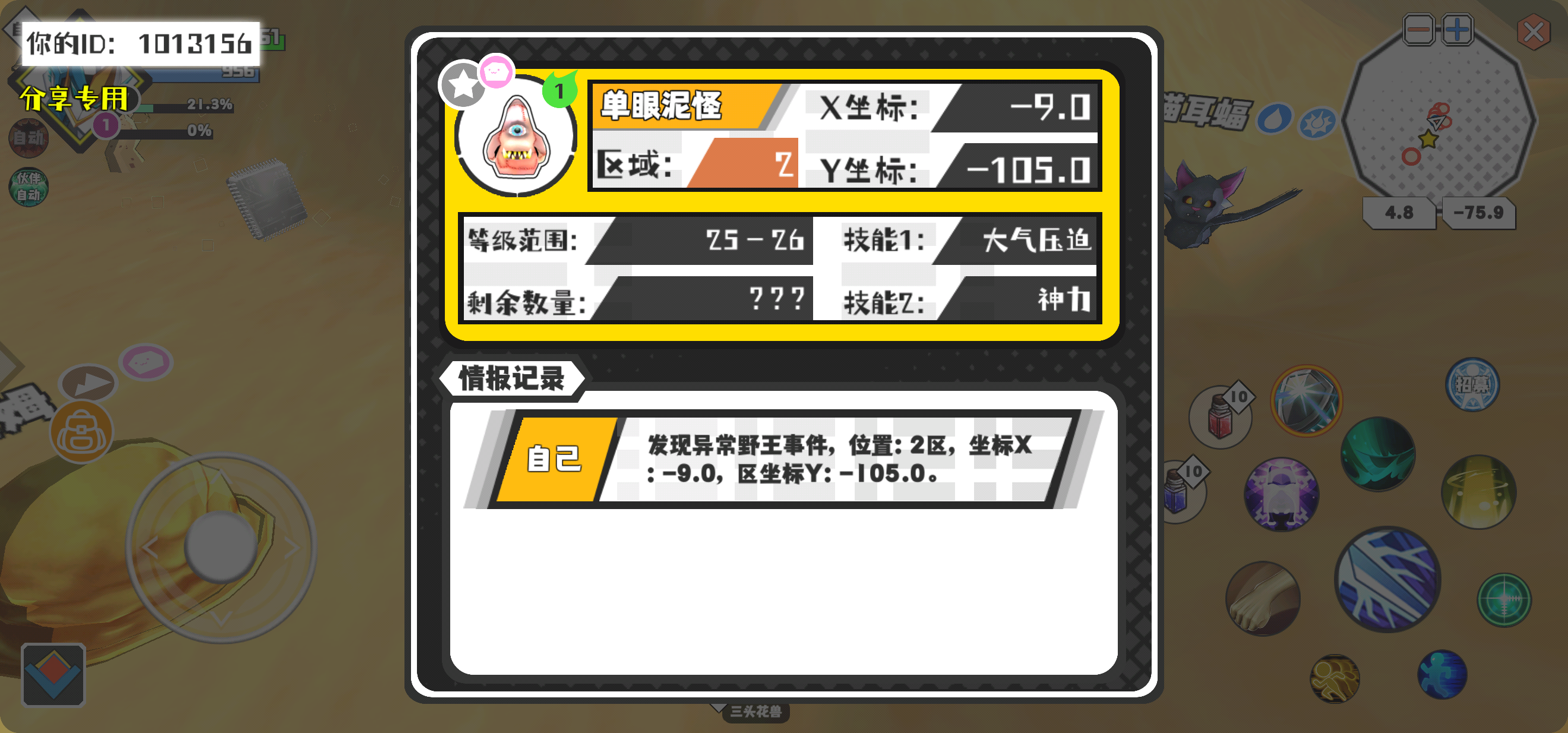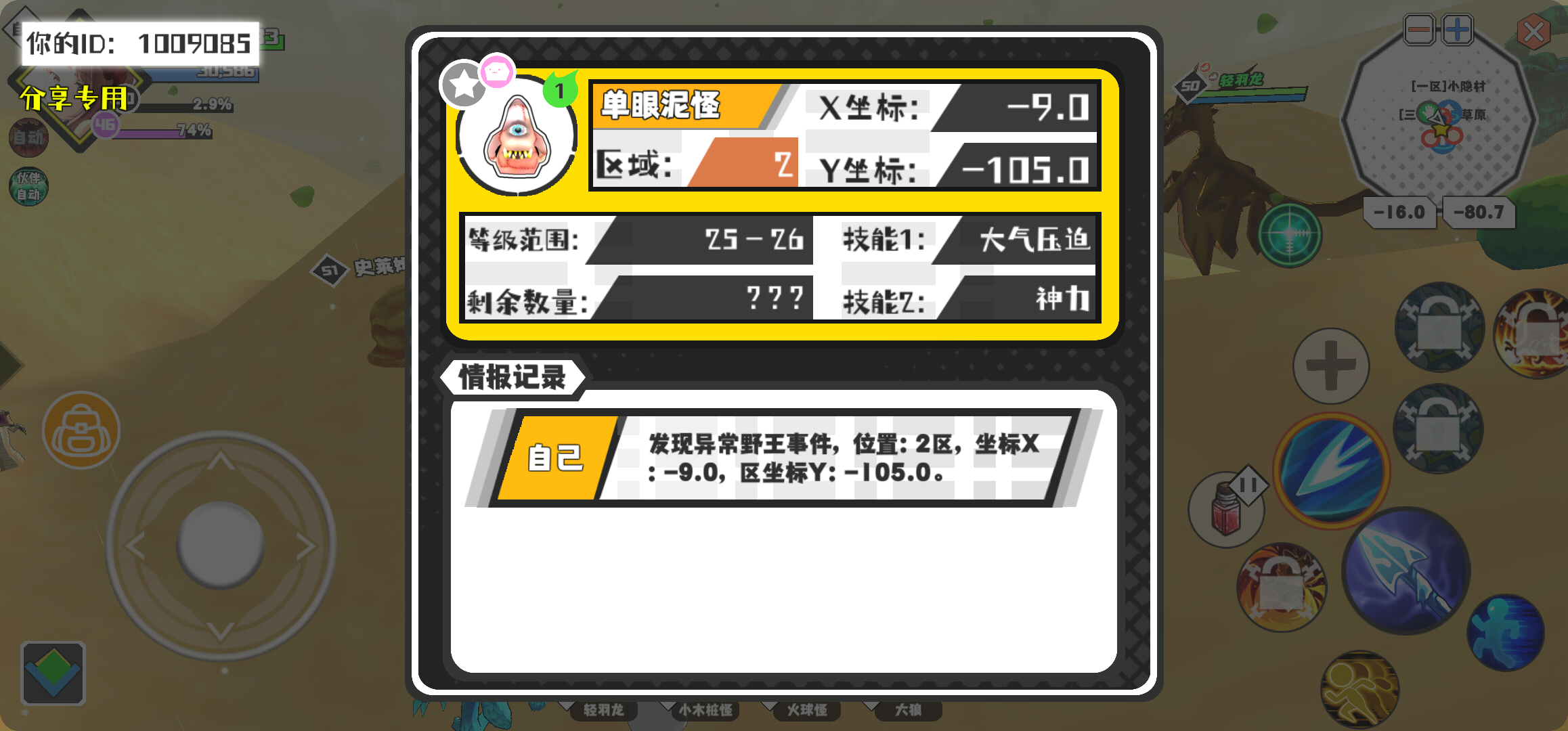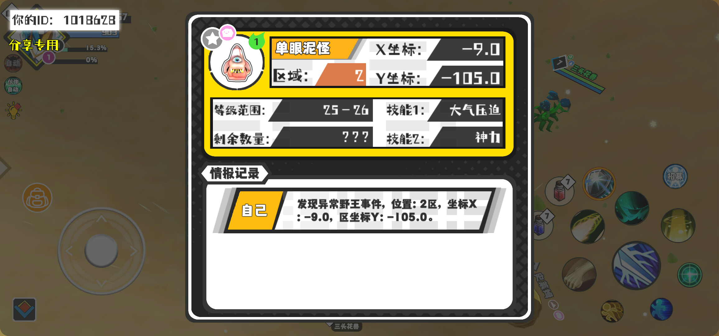幸运时刻分享! 【野王异常出没】2月23日下午10点 - 单眼泥怪【强度1】 【2区】 【X:-9.0, Y:-105.0】