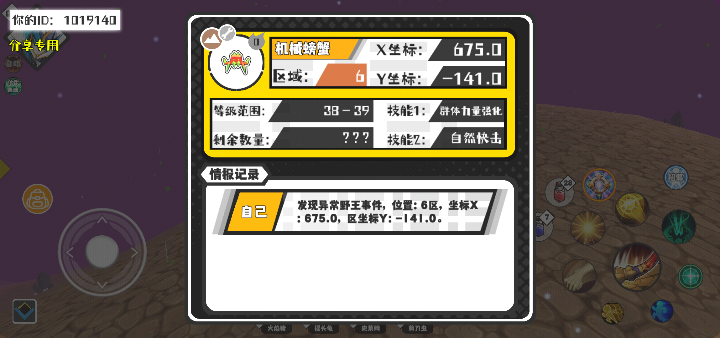 幸运时刻分享! 【野王异常出没】2月23日上午12点 - 机械螃蟹【强度0】 【6区】 【X:675.0, Y:-141.0】