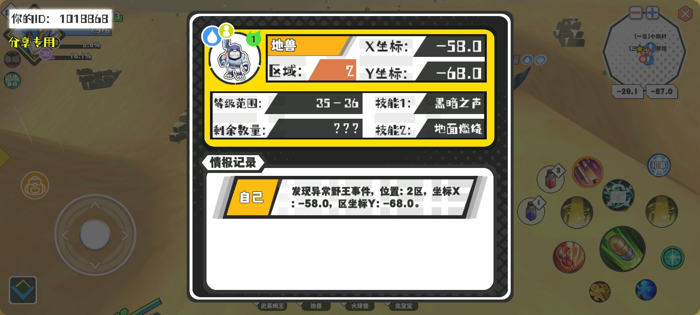 幸运时刻分享! 【野王异常出没】2月22日下午10点 - 地兽【强度1】 【2区】 【X:-58.0, Y:-68.0】