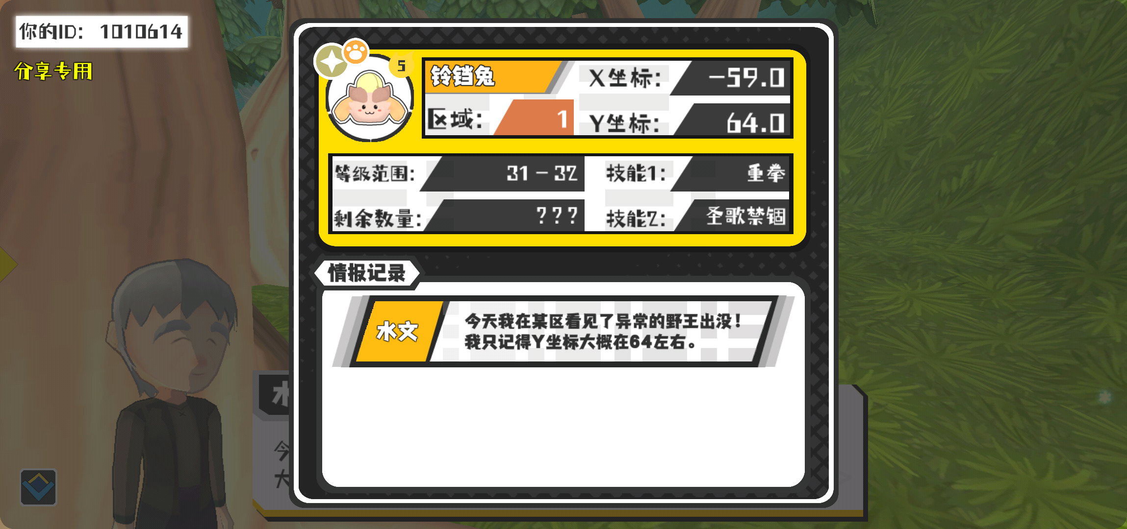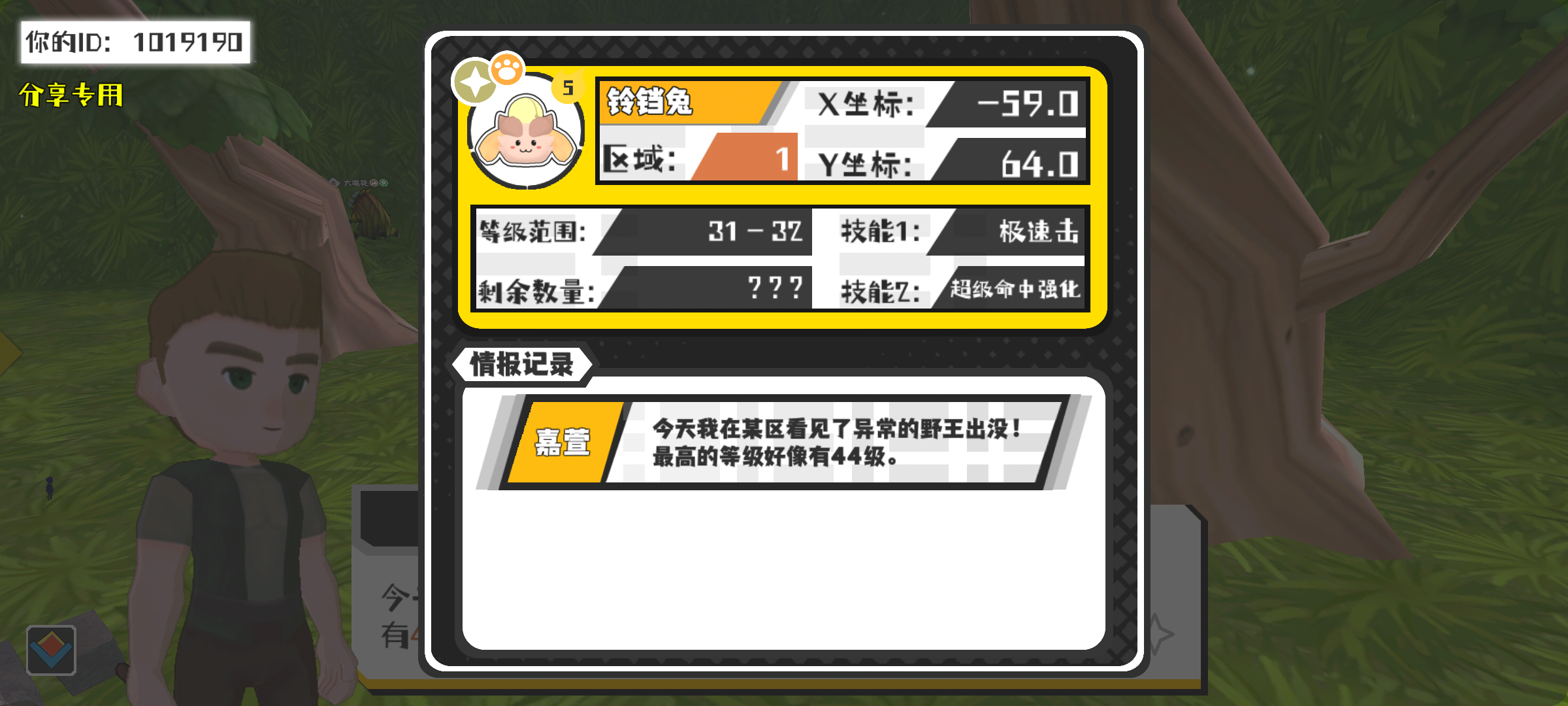 幸运时刻分享! 【野王异常出没】2月22日下午1点 - 铃铛兔【强度5】 【1区】 【X:-59.0, Y:64.0】