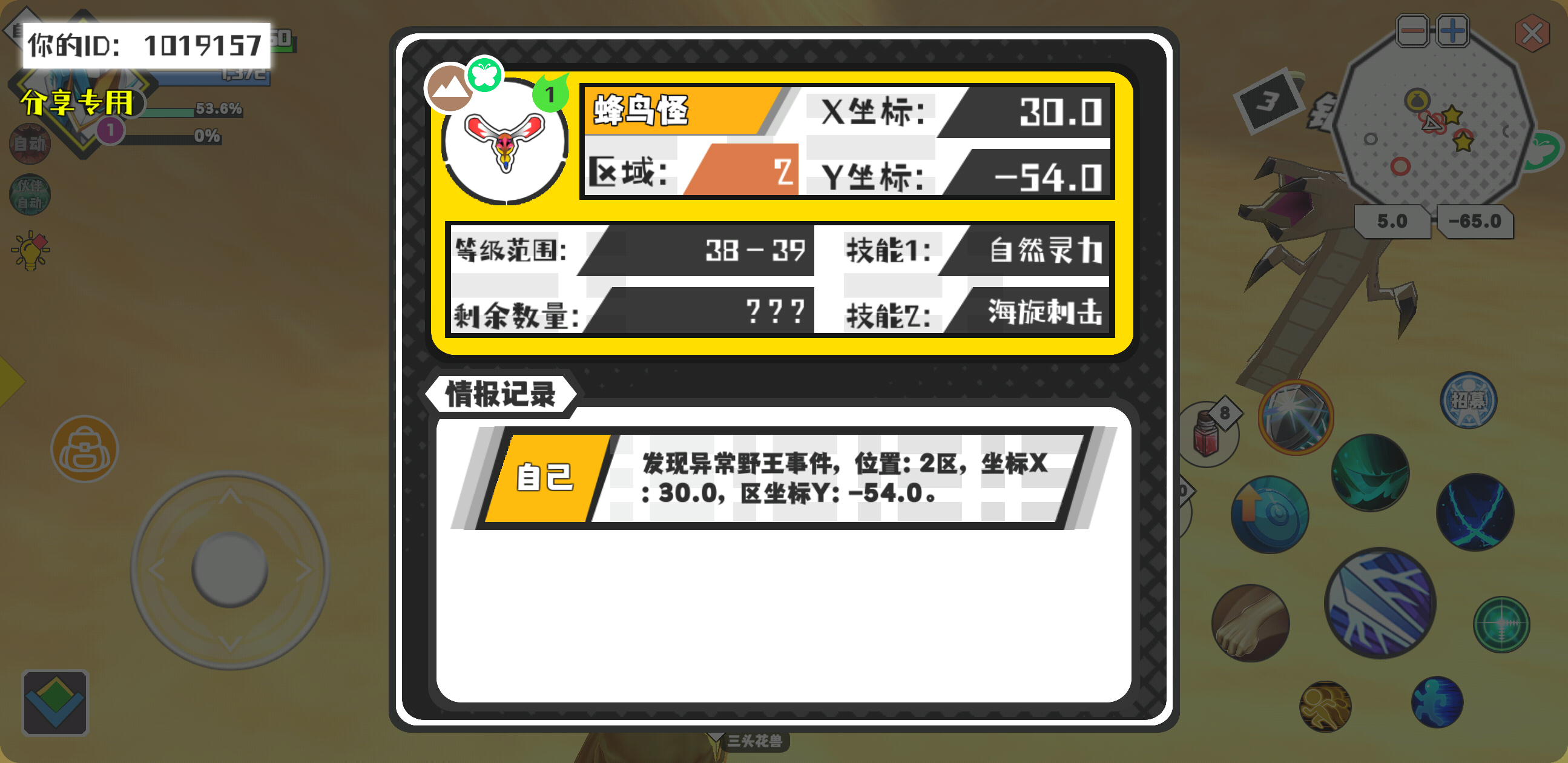 幸运时刻分享! 【野王异常出没】2月22日下午12点 - 蜂鸟怪【强度1】 【2区】 【X:30.0, Y:-54.0】