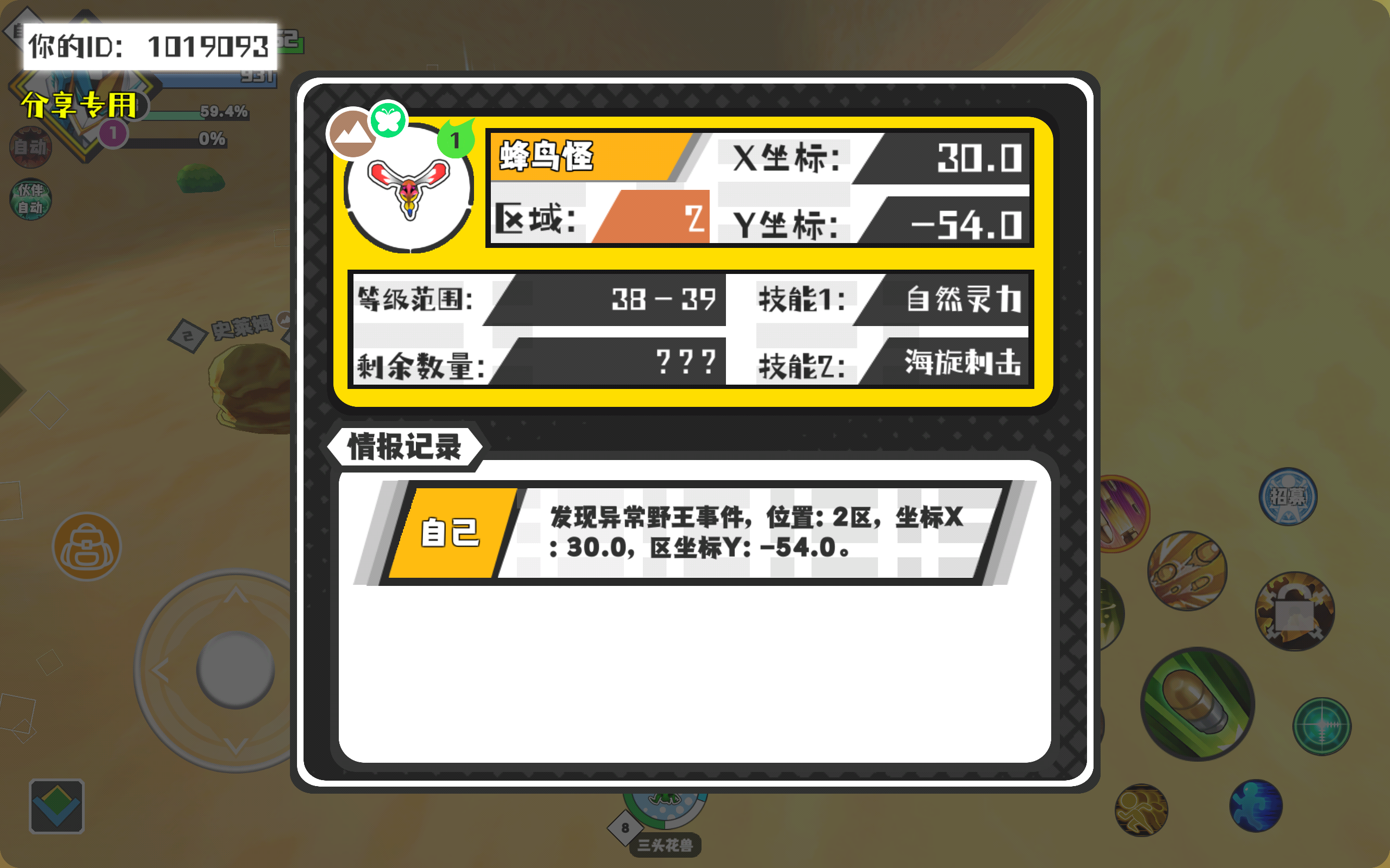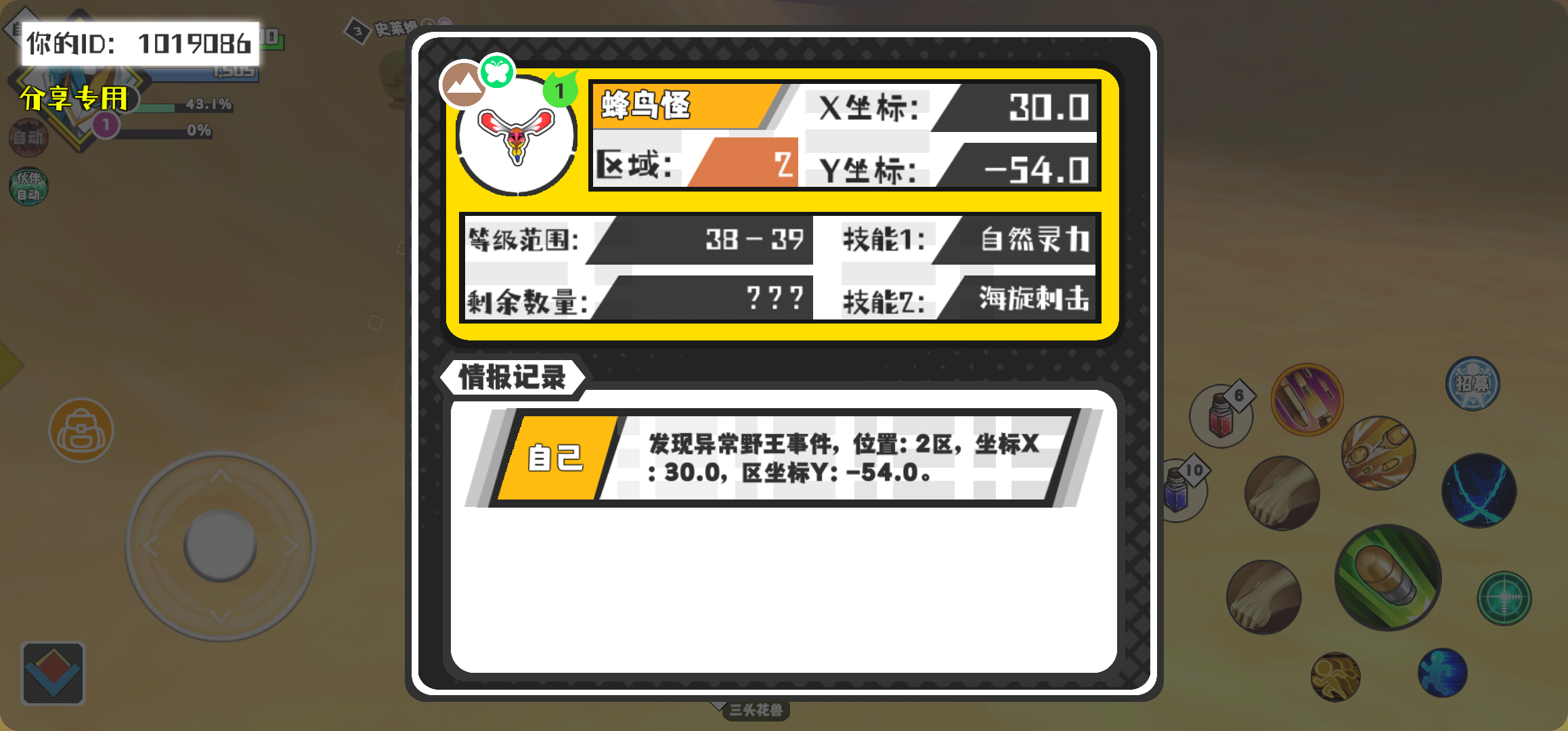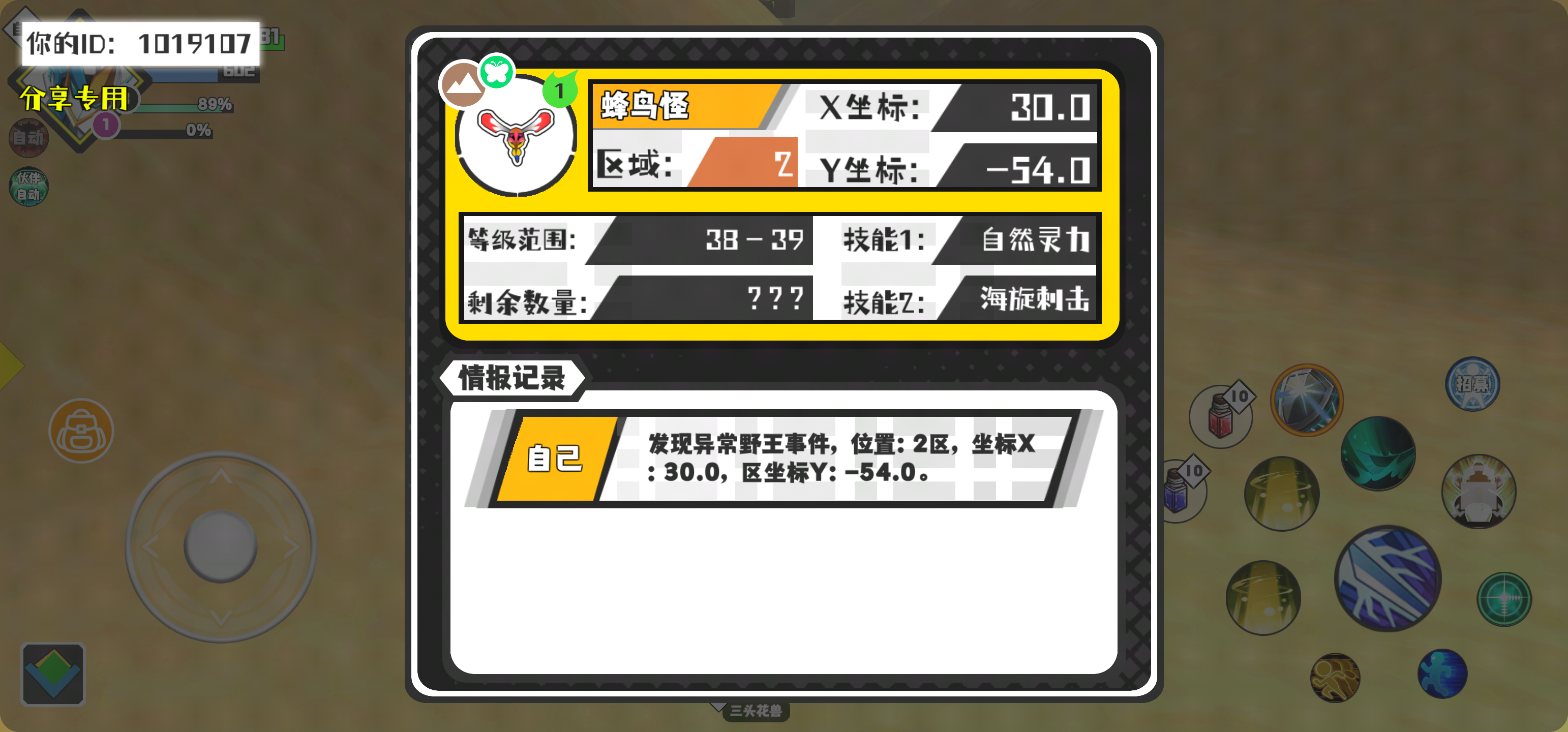 幸运时刻分享! 【野王异常出没】2月21日下午11点 - 蜂鸟怪【强度1】 【2区】 【X:30.0, Y:-54.0】