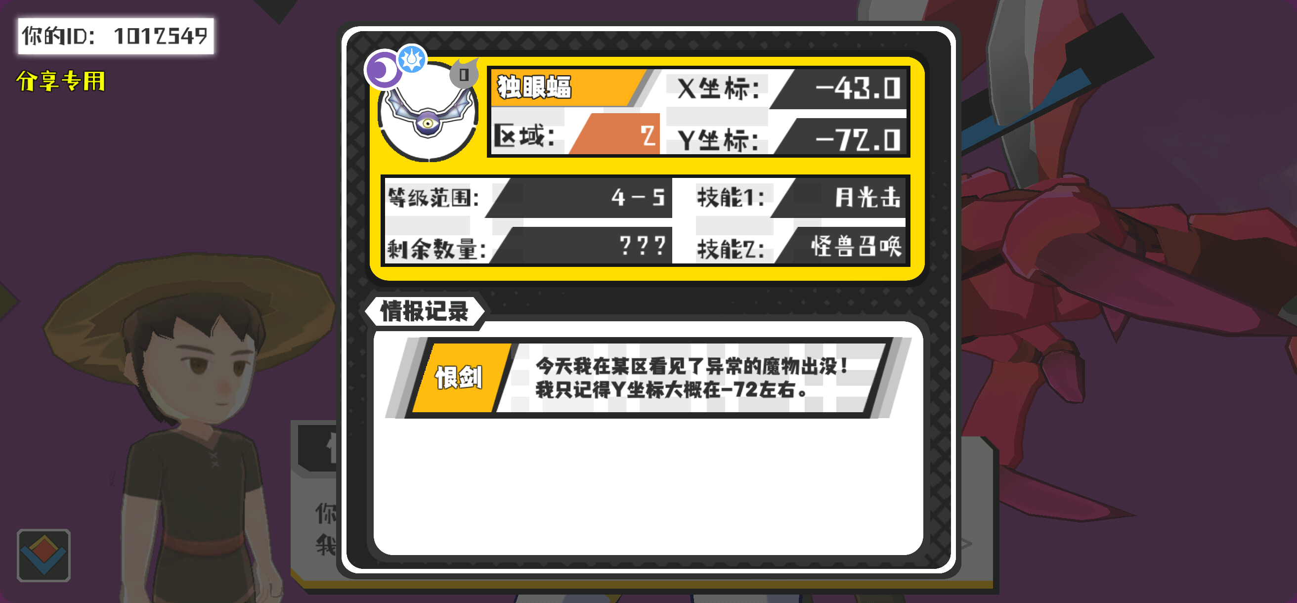 幸运时刻分享! 【魔物异常出没】2月19日下午5点 - 独眼蝠【强度0】 【2区】 【X:-43.0, Y:-72.0】