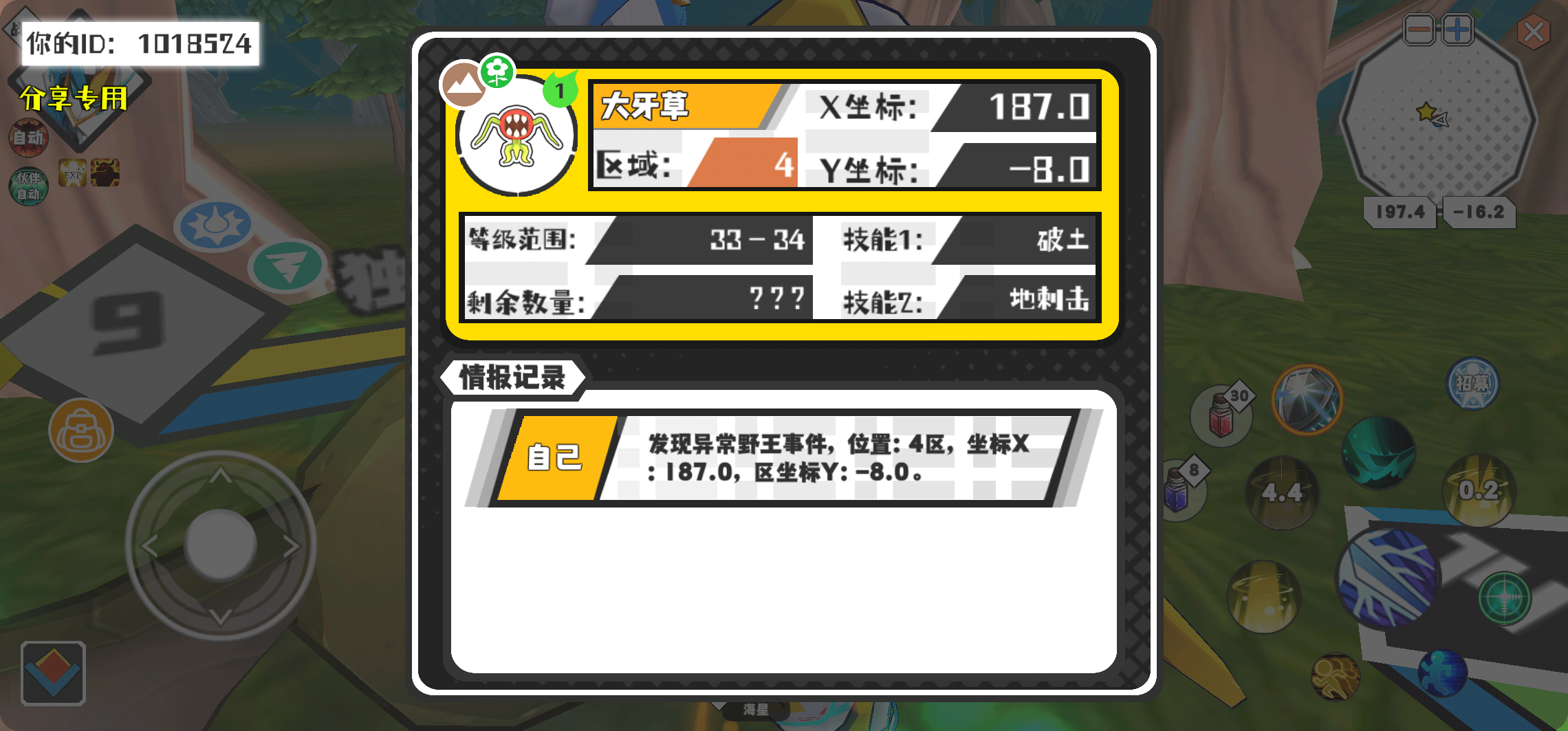 幸运时刻分享! 【野王异常出没】2月16日下午2点 - 大牙草【强度1】 【4区】 【X:187.0, Y:-8.0】
