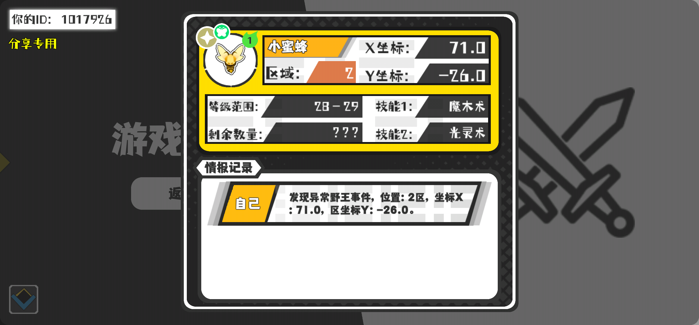 幸运时刻分享! 【野王异常出没】2月11日下午9点 - 小蜜蜂【强度1】 【2区】 【X:71.0, Y:-26.0】