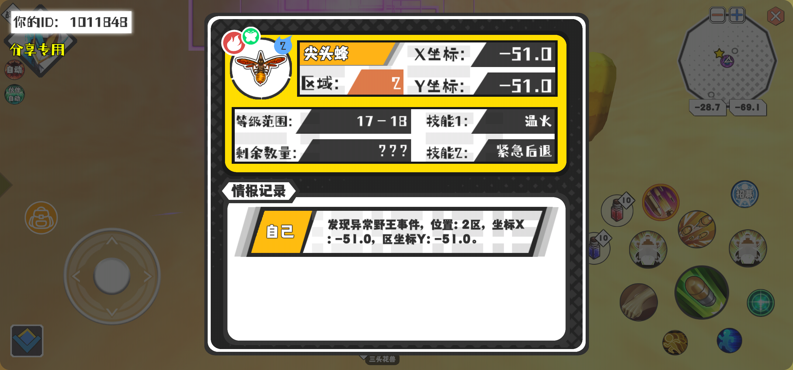 幸运时刻分享! 【野王异常出没】2月8日下午12点 - 尖头蜂【强度2】 【2区】 【X:-51.0, Y:-51.0】