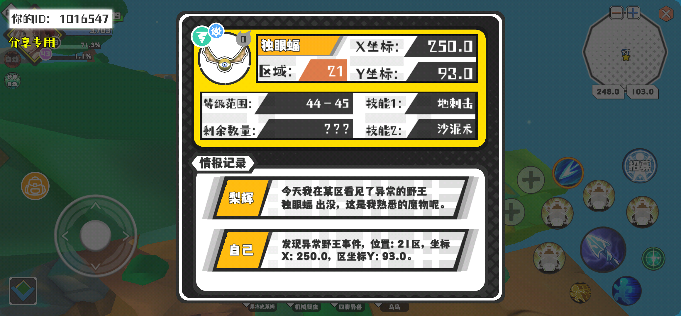 幸运时刻分享! 【野王异常出没】2月8日下午4点 - 独眼蝠【强度0】 【21区】 【X:250.0, Y:93.0】