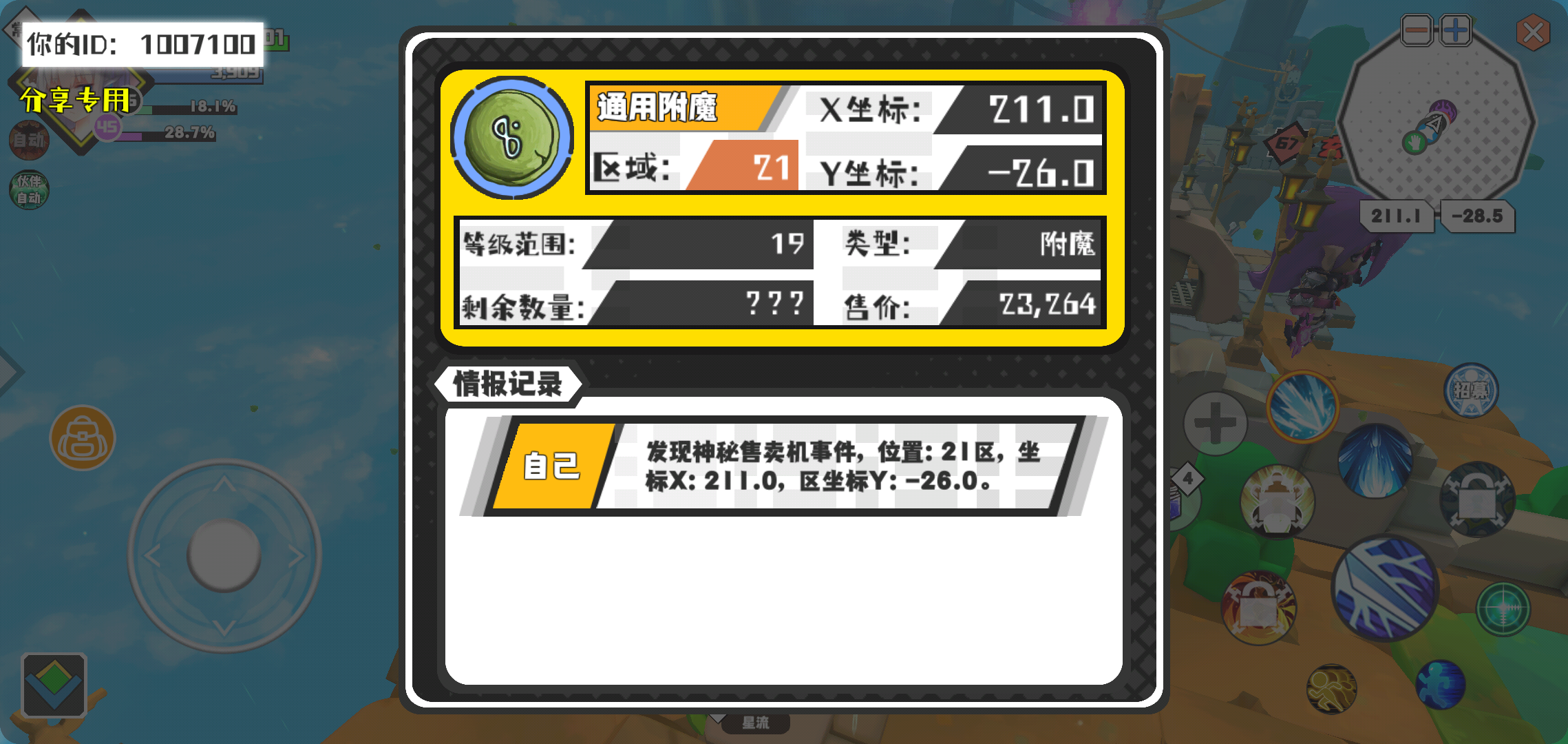 幸运时刻分享! 【神秘售卖机】2月5日下午3点 - 通用附魔【19级 】【稀有度:稀有】 【21区】 【X:211.0, Y:-26.0】