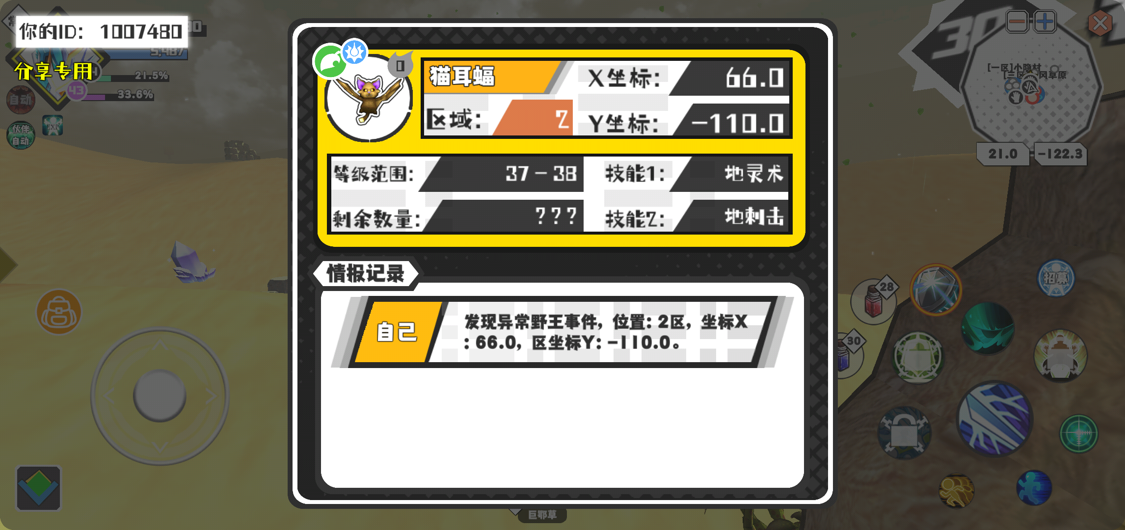 幸运时刻分享! 【野王异常出没】2月5日上午9点 - 猫耳蝠【强度0】 【2区】 【X:66.0, Y:-110.0】