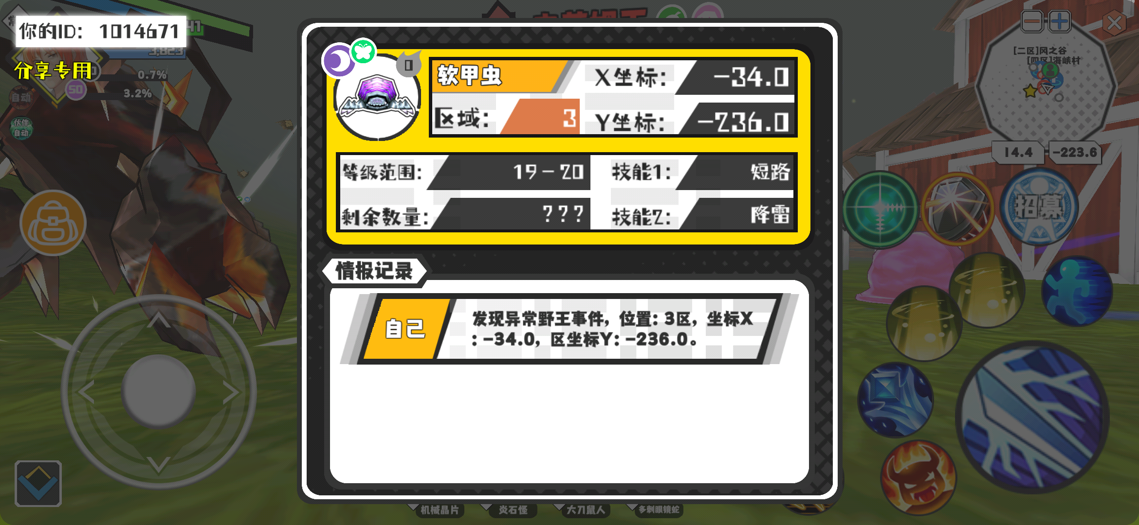 【野王异常出没】12月30日上午8点 - 软甲虫【强度0】 【3区】 【X:-34.0, Y:-236.0】
