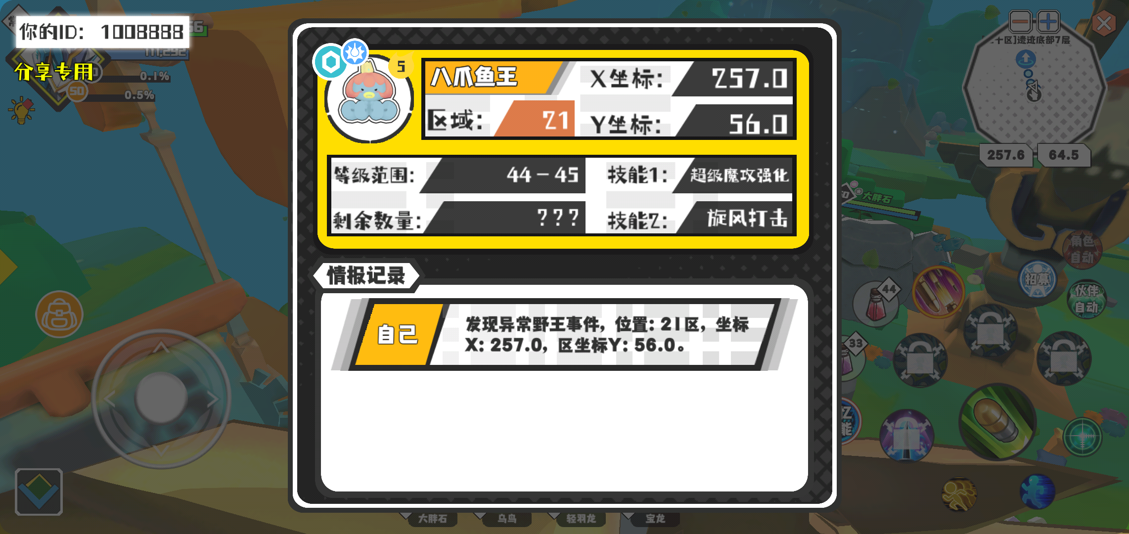 幸运时刻分享! 【野王异常出没】4月1日下午11点 - 八爪鱼王【强度5】 【21区】 【X:257.0, Y:56.0】