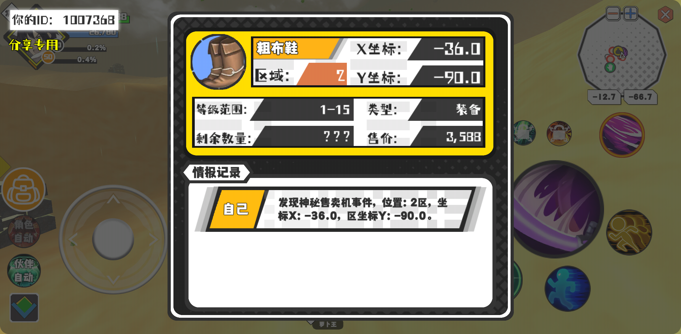 幸运时刻分享! 【神秘售卖机】3月22日下午10点 - 粗布鞋【1-15级 】【稀有度:稀有】 【2区】 【X:-36.0, Y:-90.0】