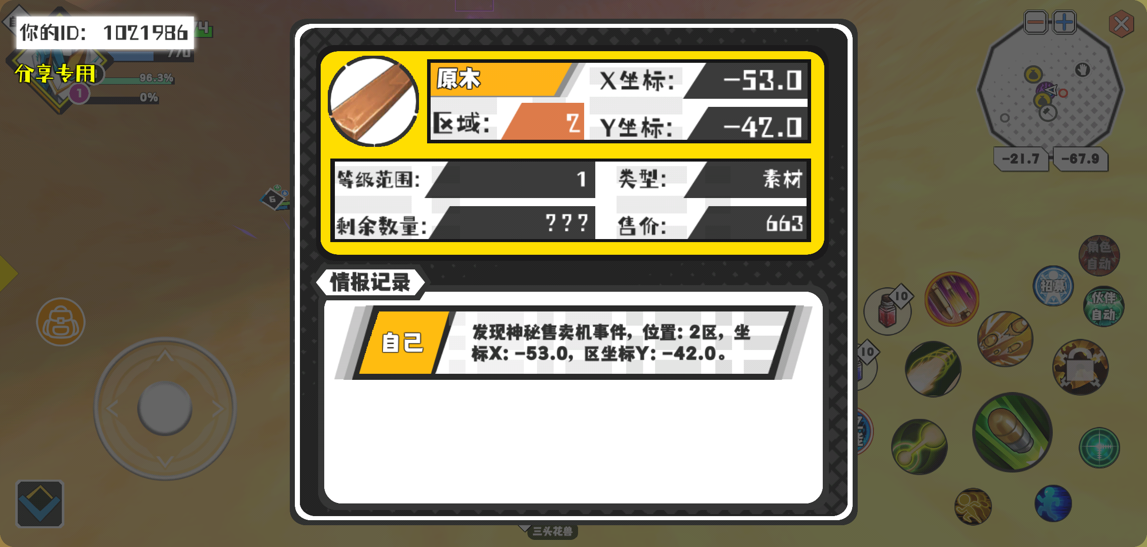 幸运时刻分享! 【神秘售卖机】3月22日下午10点 - 原木【1级 】【稀有度:稀有】 【2区】 【X:-53.0, Y:-42.0】
