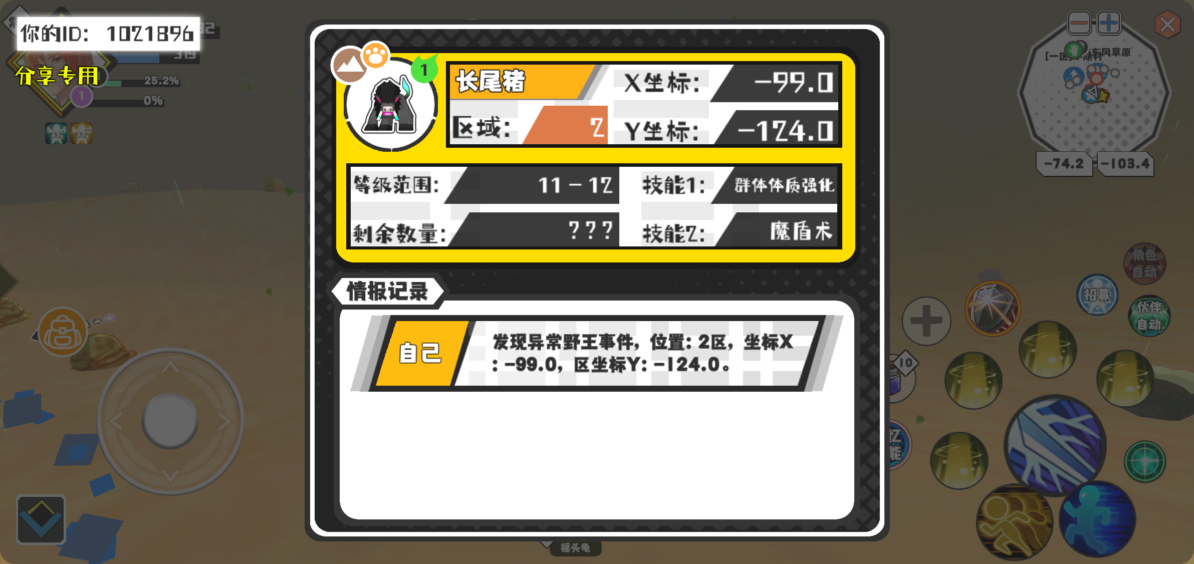 幸运时刻分享! 【野王异常出没】3月21日下午12点 - 长尾猪【强度1】 【2区】 【X:-99.0, Y:-124.0】