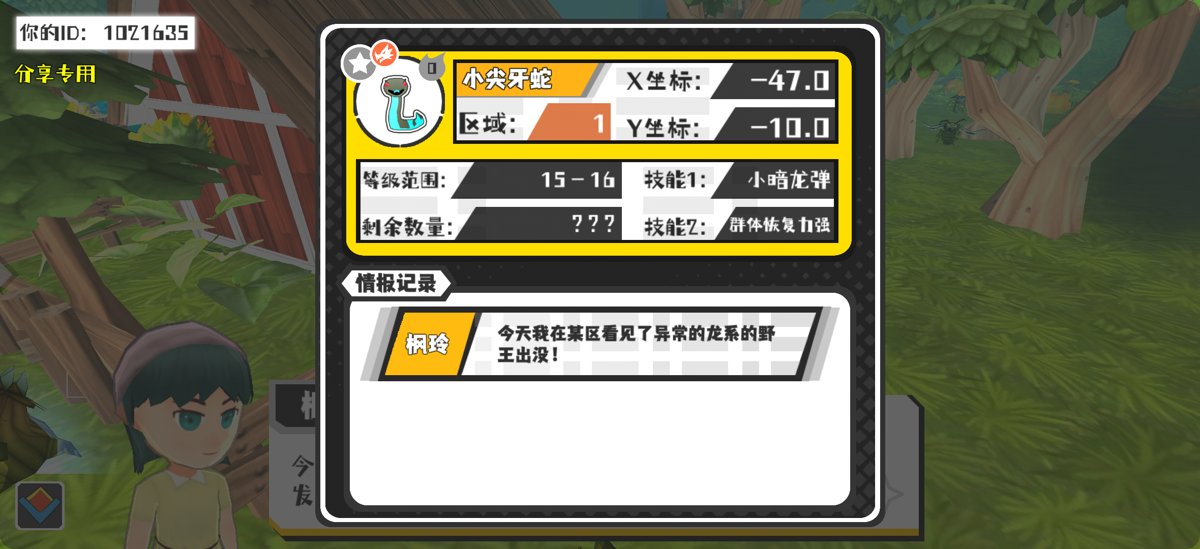 幸运时刻分享! 【野王异常出没】3月14日下午7点 - 小尖牙蛇【强度0】 【1区】 【X:-47.0, Y:-10.0】