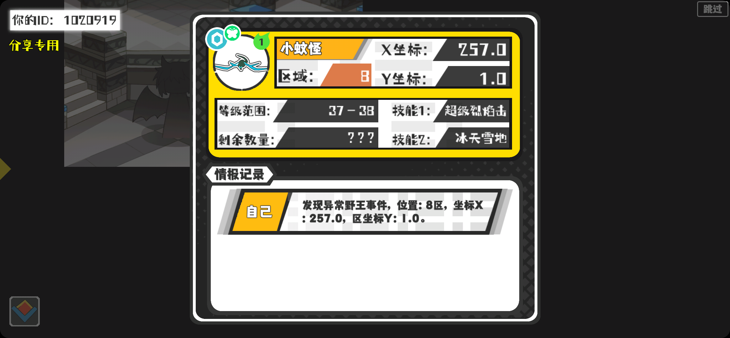 幸运时刻分享! 【野王异常出没】3月13日上午12点 - 小蚊怪【强度1】 【8区】 【X:257.0, Y:1.0】