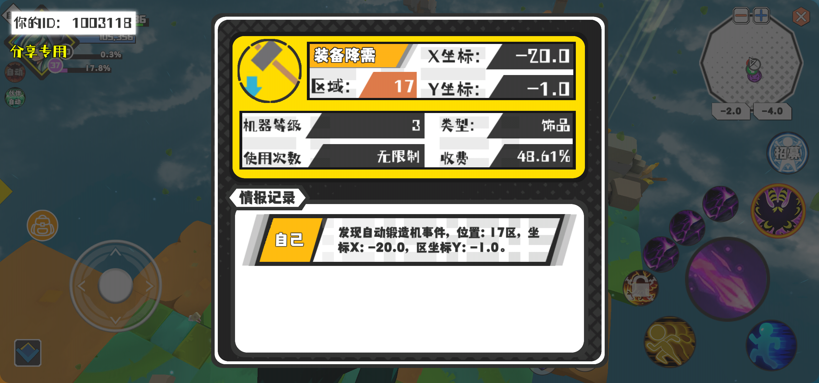 幸运时刻分享! 【自动锻造机】3月12日上午11点 - 装备降需【3级机器】 【17区】 【X:-20.0, Y:-1.0】