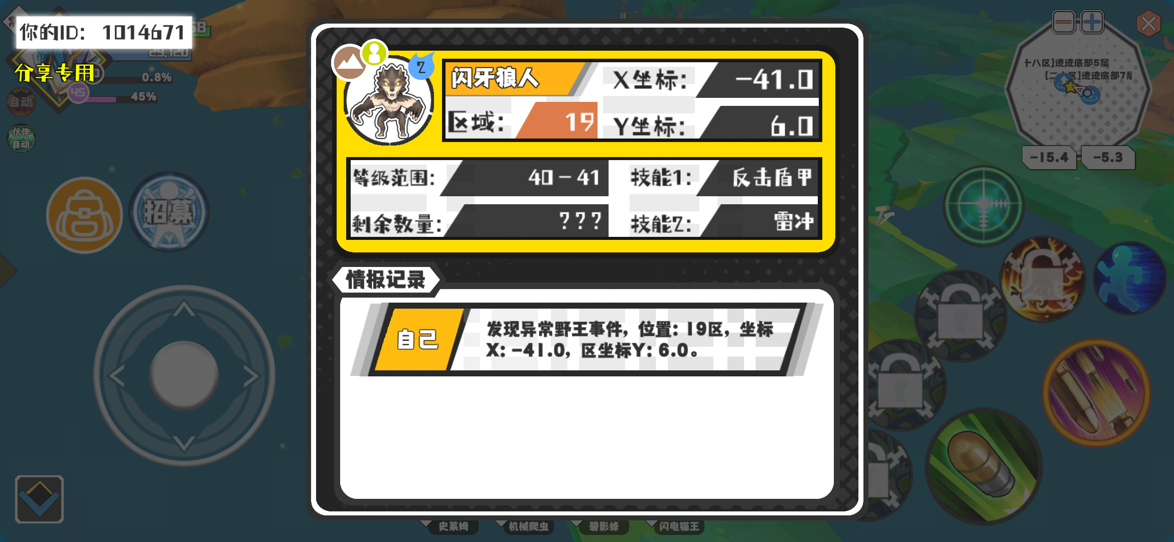 幸运时刻分享! 【野王异常出没】3月9日下午10点 - 闪牙狼人【强度2】 【19区】 【X:-41.0, Y:6.0】