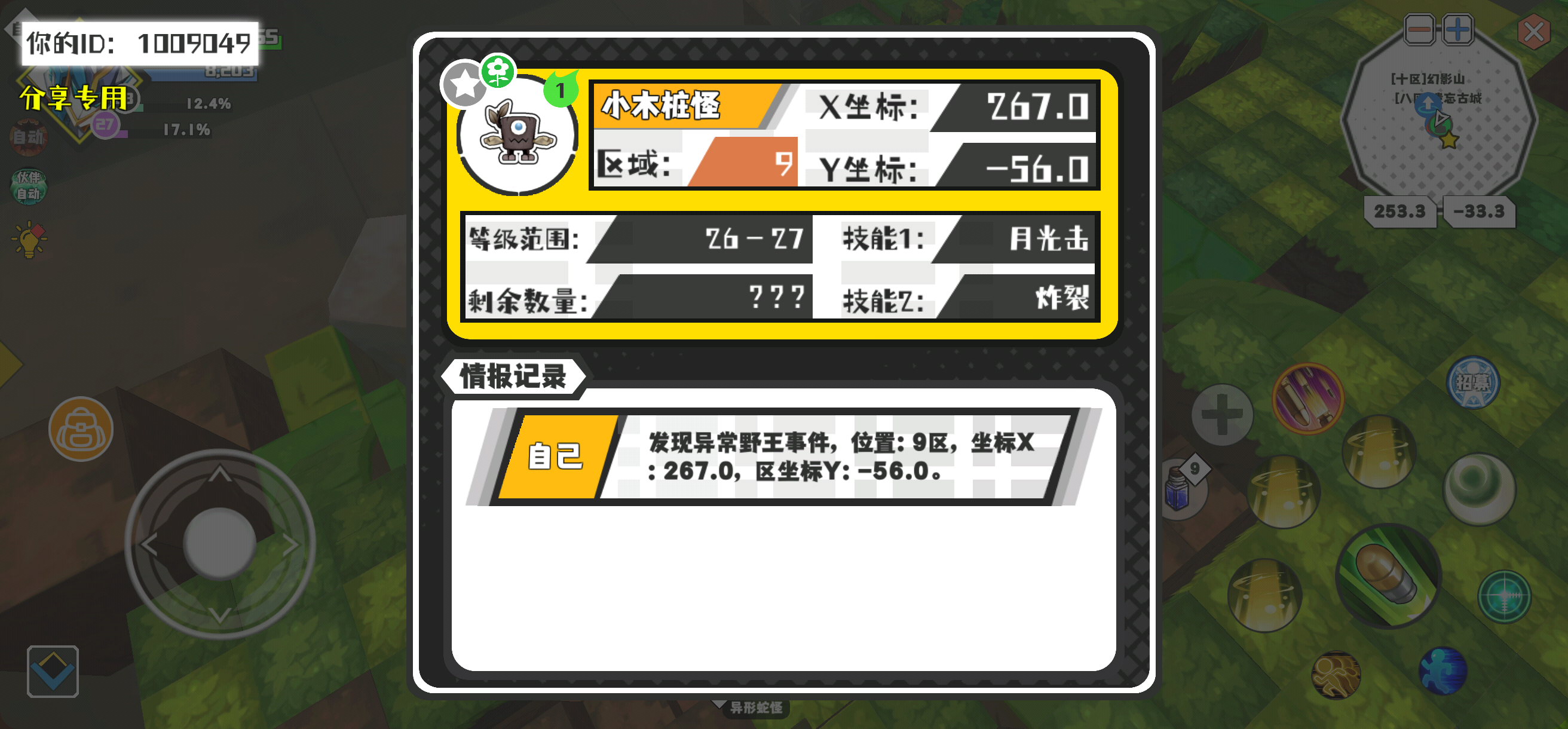幸运时刻分享! 【野王异常出没】3月9日下午11点 - 小木桩怪【强度1】 【9区】 【X:267.0, Y:-56.0】