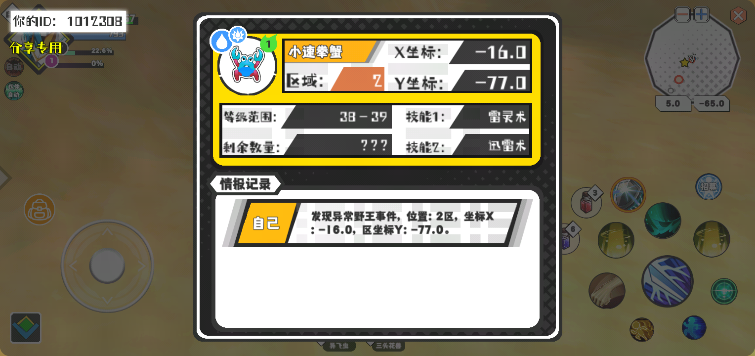 幸运时刻分享! 【野王异常出没】3月8日上午10点 - 小速拳蟹【强度1】 【2区】 【X:-16.0, Y:-77.0】