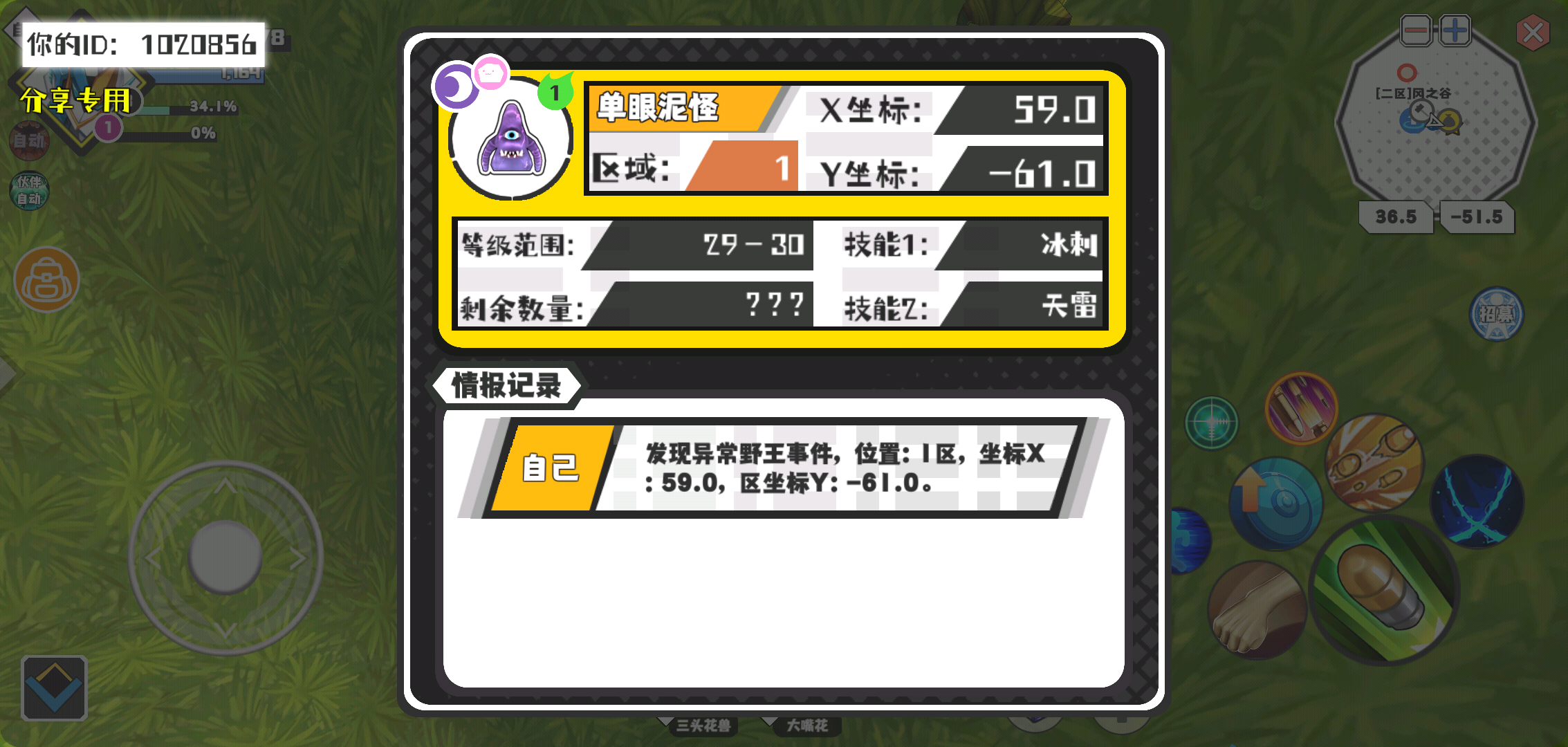 幸运时刻分享! 【野王异常出没】3月7日上午9点 - 单眼泥怪【强度1】 【1区】 【X:59.0, Y:-61.0】
