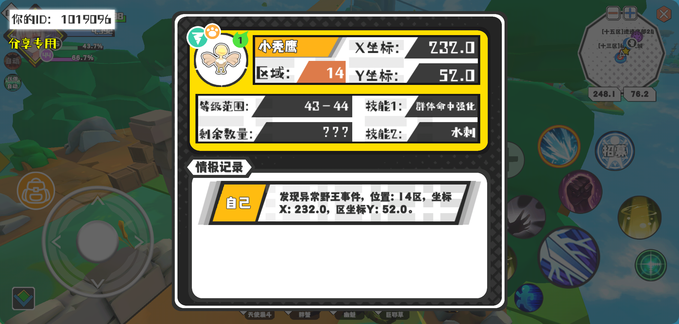 幸运时刻分享! 【野王异常出没】3月6日上午9点 - 小秃鹰【强度1】 【14区】 【X:232.0, Y:52.0】