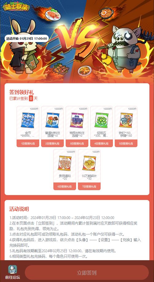 亲爱的老板们鸭鸭来送一月福利啦〓活动时间〓 2024-1-29 17:00至2024-2-23 12:00〓活动详情〓即可领取👆👆👆〓参与方式〓1、限时内点击签到礼包进入签到页,再点击下方的签到即可参与2、获取礼包码后,游戏内点击【头像】——【设置】——【兑换】输入即可兑换#游戏安利#游戏推荐#游戏讨论#游戏福利#宝藏厂商