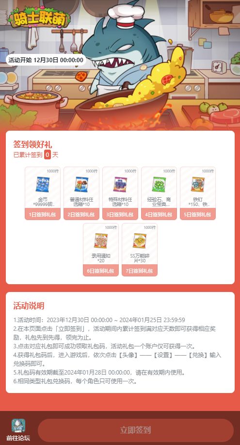 亲爱的老板们鸭鸭来送一月福利啦〓活动时间〓 2023-12-30 00:00至2024-1-25 23:59〓活动详情〓链接即可领取👆👆👆〓参与方式〓1、限时内点击签到礼包进入签到页,再点击下方的签到即可参与2、获取礼包码后,游戏内点击【头像】——【设置】——【兑换】输入即可兑换#游戏安利#游戏推荐#游戏讨论#游戏福利#福利活动