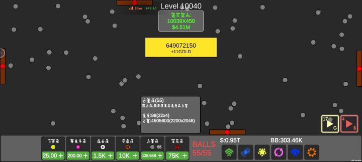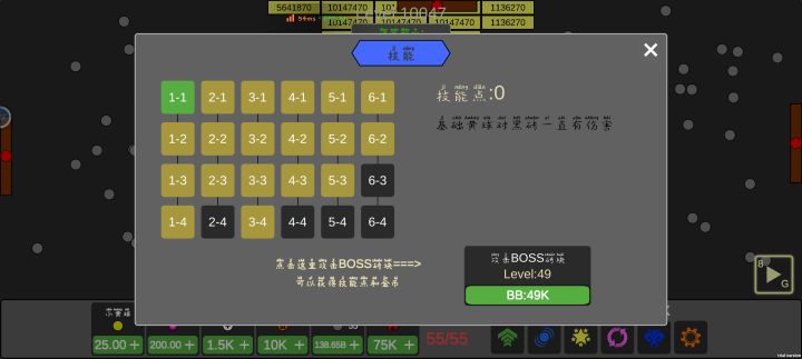 点击的伤害不需要升级太多,升级的话最前面的两个可以少升一点,力量球太贵。先把前面三个的球球数量点到最满,然后慢慢用狙击球替代小黄球,升级的时候哪个便宜就升那个。前面三个不需要升级太多,因为后期没啥用。