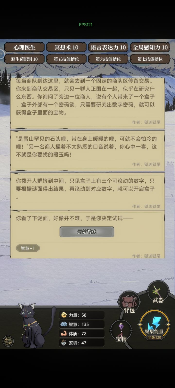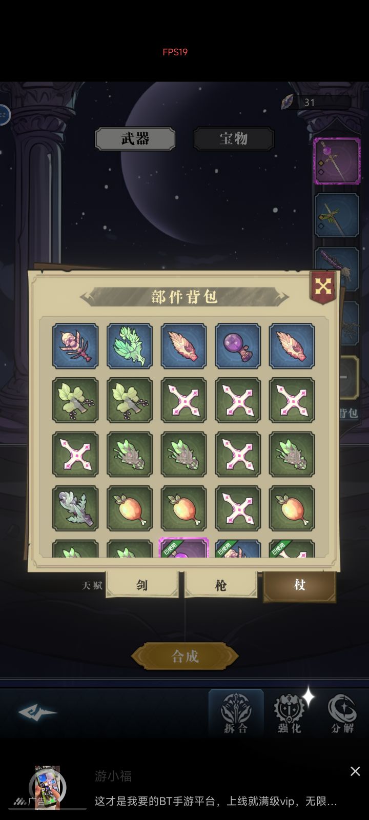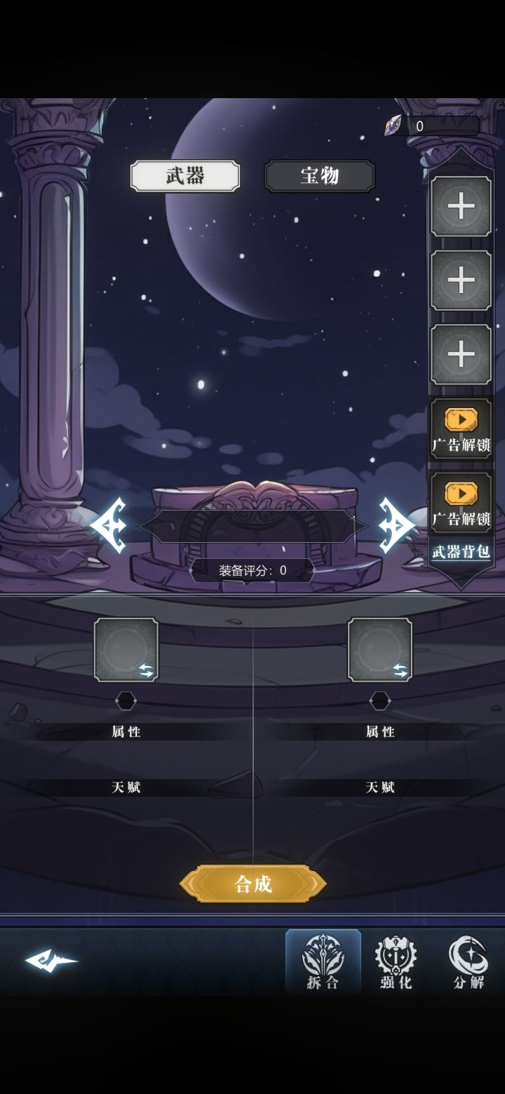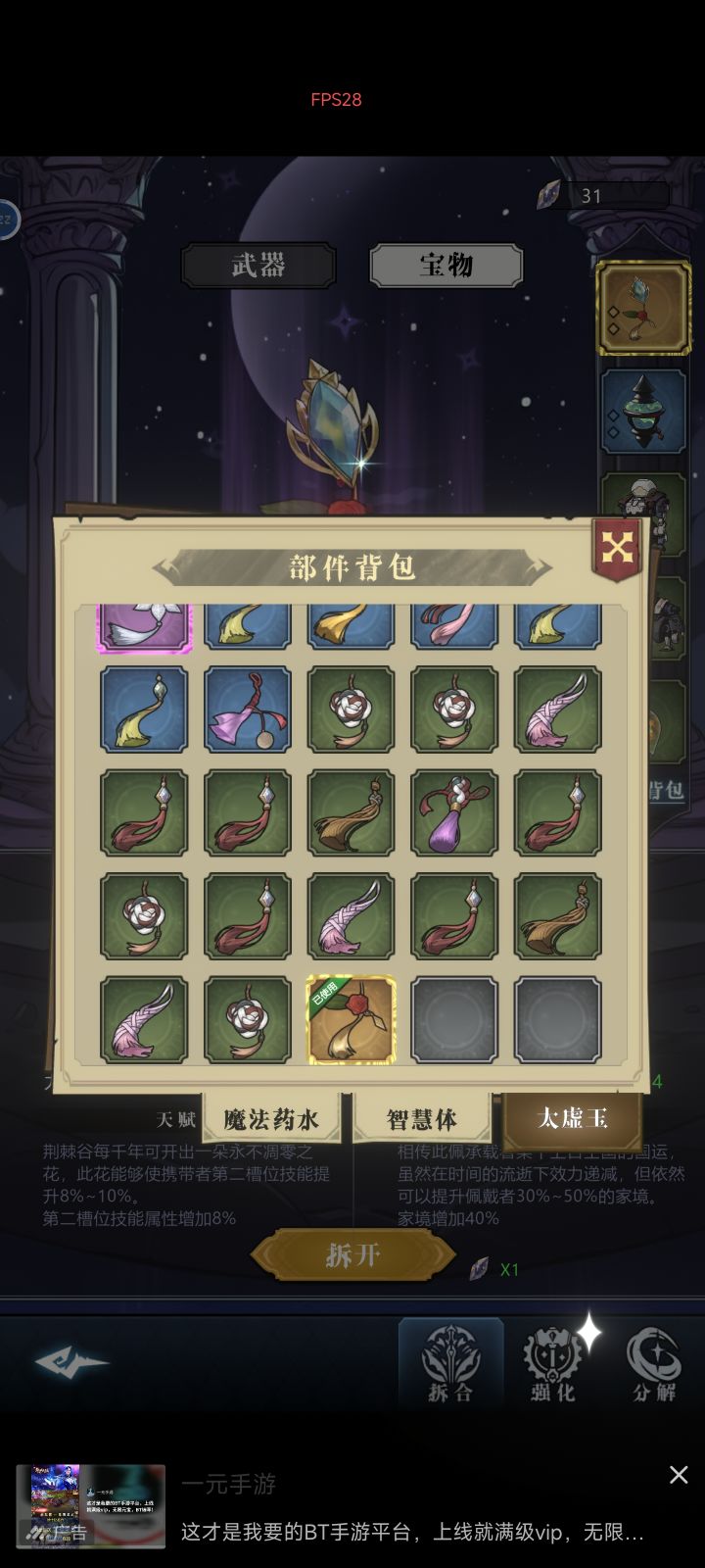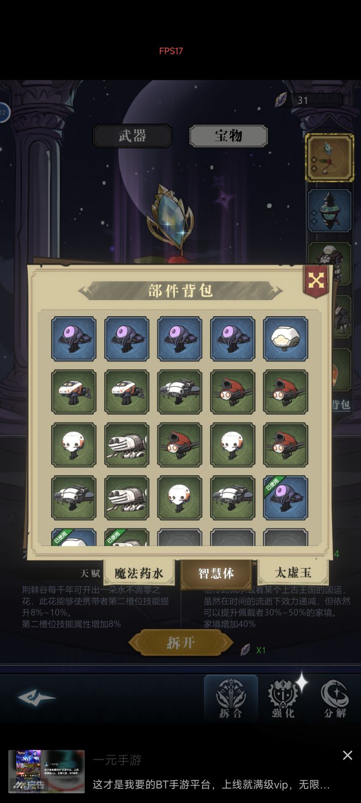 职业选择那里,后面三个框有什么意义吗,选了职业对应的三个技能就必须全勾上才开始游戏,但玩到现在没感觉有什么用,我看宝物有增强某某技能槽的功能,但游戏进程里没体现出技能的效果。还有装备拆合功能那里,我只会把装备装上,然后点拆开,好麻烦但我没发现其他拆的方法,明明背包里点装备可以直接分解的为什么不可以直接拆,气抖冷。游戏里好多东西都没有说明,可能作者默认大家都是老玩家了就没注意吧。物品简介应该是想