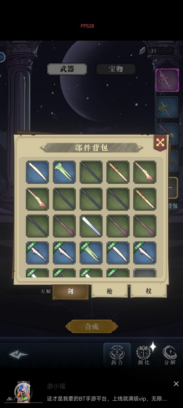 官方大大,这边武器宝物的分解系统可以做一个四种品质分别选择一键分解的功能,因为玩了一些时间后,加上官方送的抽,剩下的紫色蓝色绿色品质就显得多余,而目前只能一个一个慢慢点,希望能优化一下,提高游戏体验(虽然不是很重要的问题,但这类游戏总是靠细节来吸引玩家的,希望能尽快优化)