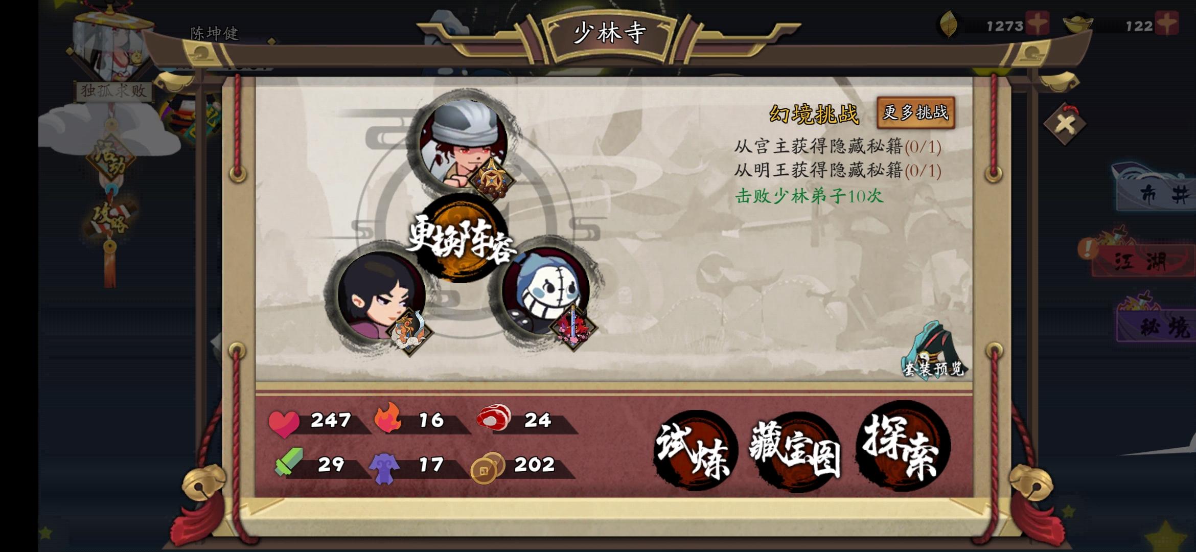 我拿南苑大王,带的俩中立,中途没换过英雄,打了血战五倍的少林问道普通难度两次,探索少林问道普通难度两次,打完去看南苑的羁绊,两个通关少林普通难度还是0/5。不知道是什么神奇的bug