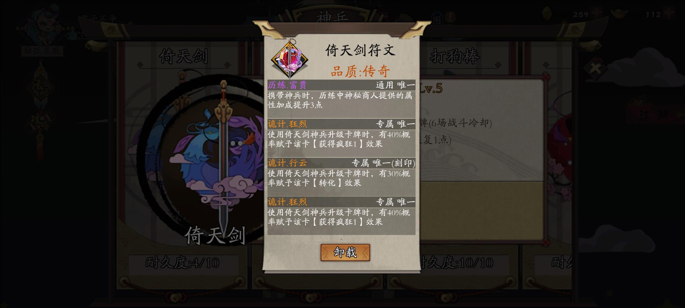 神器倚天剑诡计.狂列概率问题。我在使用气宗时升级基本卡片基本是必然获得狂列的,但是在豪侠使用是概率触发貌似存在问题。个人尝试豪侠狂列概率成功比较低