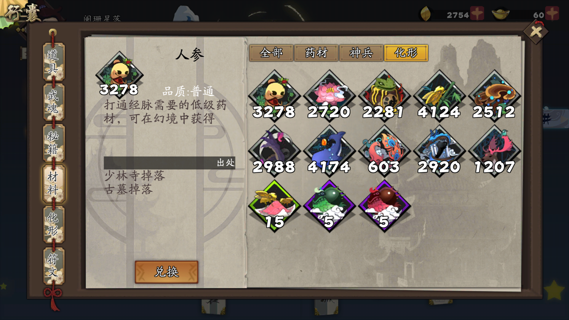 从行囊-材料-神兵/化形界面关掉后再打开行囊会跑到药材界面,但标签还是化形,需要手动换两下标签切换回来,问题倒不大,就是稍微废点手。。。
