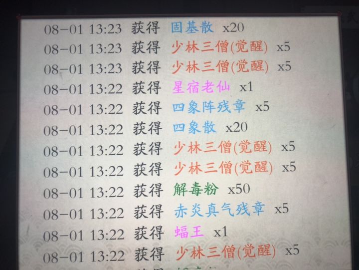 入坑1个多月,小氪了几百,ios刚更新,准备了240抽,出了8个橙色武侠(3个剑魔,一个猴子),50个三僧碎片,15个万能,上次220出的黑周!但是!!没有出新武侠,也没有出重阳,哎,心情有点复杂