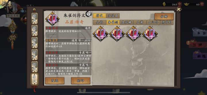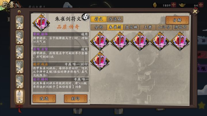 玩了有一个多月了,感觉挺好玩的冲了点小钱,符文也做了一点,基本能打的都打得过,跳神话目前条8层没啥压力。化形缺了几个主要人物,铁掌云雀赤练世子都没有。没卷轴没工坊了,每天打打雨林,是不是到了养老养成期了呢? 符文倚天剑成型了,打狗棒没红符文橙的都齐了,玉箫符文一般,巅峰阵容也能全过,绣花针目前就一个红色的符文。想存点符文卷轴,到下赛季巅峰一起做吧,大概能存个400-500个符文卷,打完宝图差不多到