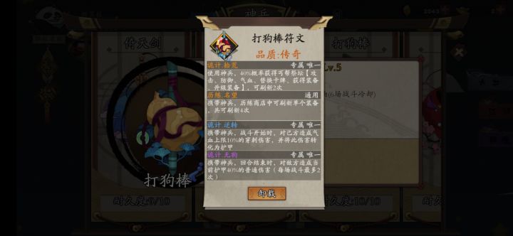 橙词条1.使用屠龙刀有30%几率再使用一次2.携带神兵时,每回合增加10攻击3.携带神兵时,每回合增加1怒气/4真气4.卡牌被移除的次数增加15.使用屠龙刀时,增加(保定)词条,被保定的卡牌被移除时进去弃牌库红词条1.使用屠龙刀有40%概率触发遗忘泉水2.无法打出的卡(诅咒卡)可以打出,但效果保留(扣血)3.卡组少于或等于5张时,攻击,防御,血量增加10%4.屠龙刀倚天剑同时上