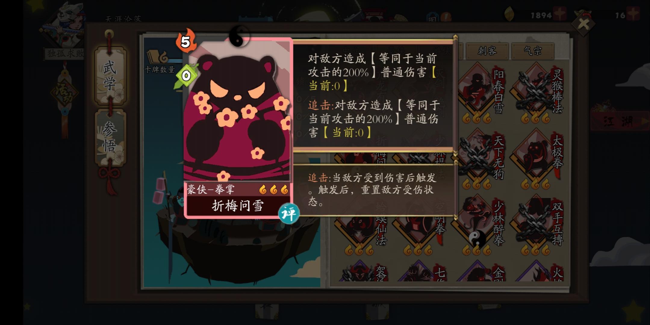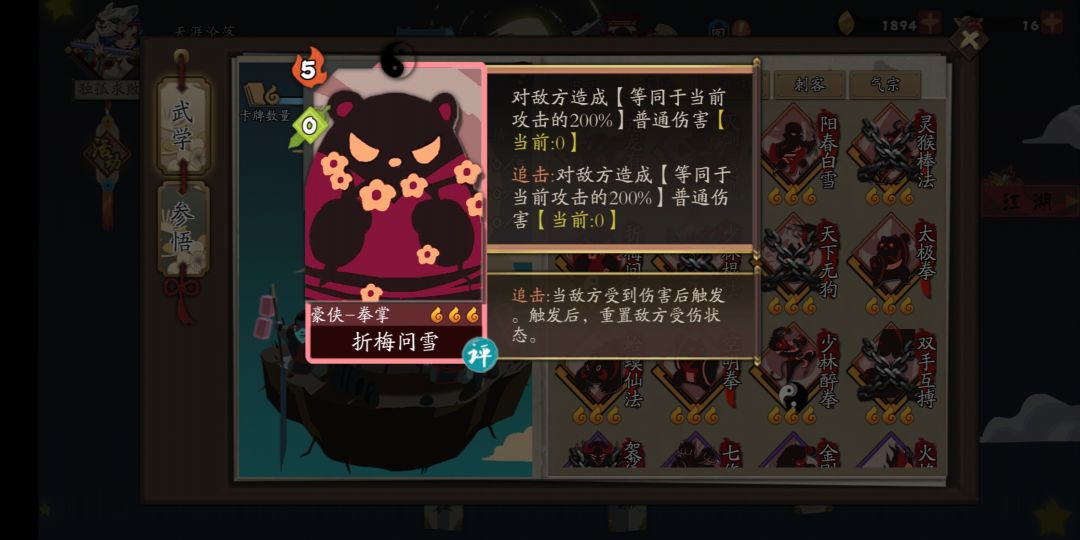 暗折梅问雪和***蟆功是两种输出类型,一个是上来伤害就高到爆炸但会衰减(紫府套,没有紫府伤害少1/3),一个是需要比较多的铺垫但没有上限。在乱拳自残连携流这种体系里面,首回合的暗折梅真的太恐怖了(视频中我的攻击很高很高才有这个效果,建议萌新后期再考虑入手)。历练机制更改后,带扇子进场,也不用复制武学,一路拿橙武学就可以得这么多。一定注意空明拳必须得有一张(没有的话,视觉效果不好哈哈哈,不会对强度有