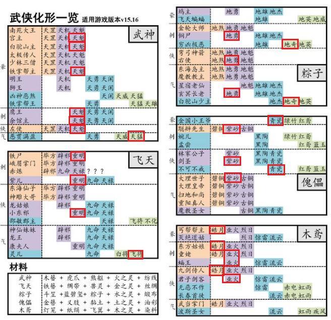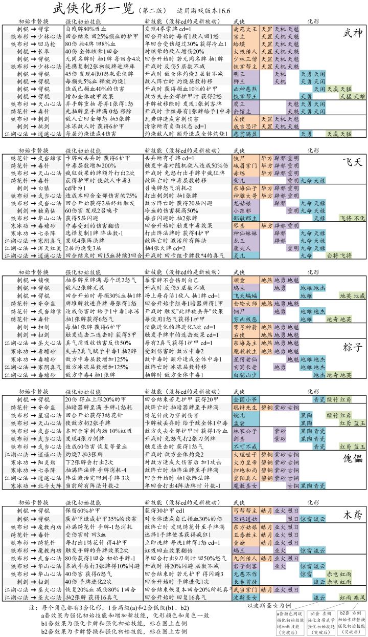 前言:历练开启有一段时间了,根据tap攻略贴&“水群”,总结了个人认为值得做的化形(轻喷哦),感谢tap用户老骚,站在巨人的肩膀上,借用化形整合图,由于可以共用化形的原因,在此上面标注感觉最清晰明了,不多废话先上图:说明:1、本帖考虑了全武侠最常用历练炼狱阵容,最常用武侠,共用化形以达到节省材料的作用,做化形的目的也是为了减轻历练的难度,所以优先考虑刺客游侠的化形(谁是亲儿子大家都懂2333)