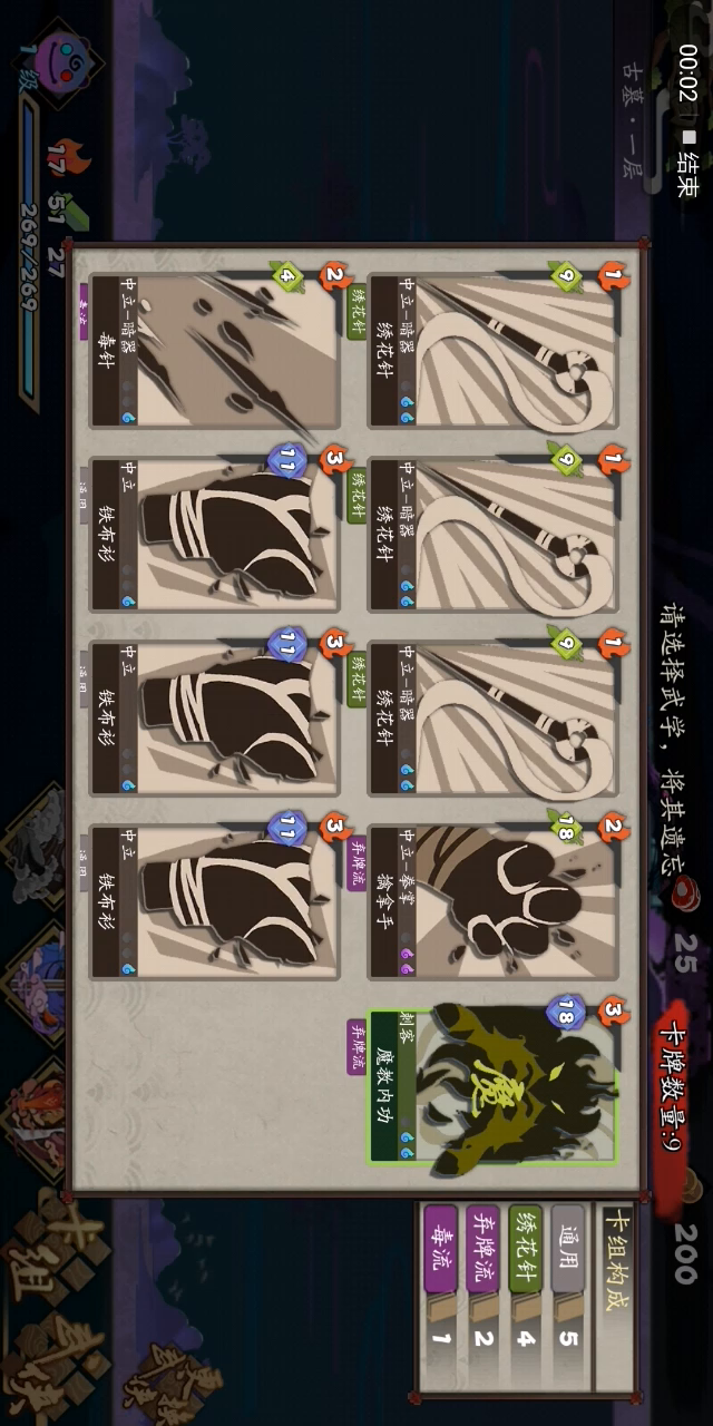 只要明王的攻击不超过10,自身防御达到95以上(这关通关时达到了史无前例的114,见图左下角,每次过祭坛优先选择防御+4),祭坛拿了吸血就能过明王。游侠的攻击在大漠依靠万剑追步流输出足够,所以只要是大漠图,拿到斩龙玄光,防御足够你就能通炼狱,无需金钟罩(武侠推荐令狐冲和左右使,有攻有防有回血有续航),刺客也是一个道理。关于万剑追步流:首先指明以下几个机制:1.实际手牌数最多为10,但计算出来的