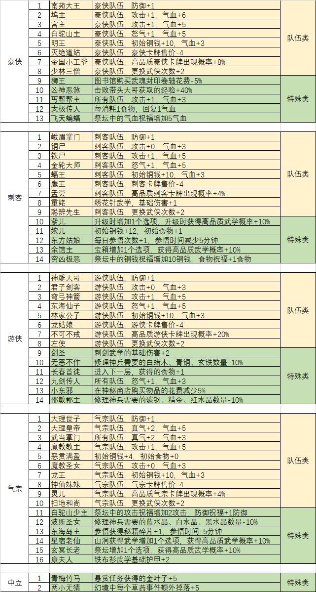 萌新一周多了,知道了角色下面那排天赋叫挂树天赋,所以整理了一下。这样自己也知道该去点什么天赋提高自己人物属性。图放下,欢迎收藏查看。黄色的是提高单个组别的,绿色的是提高所有角色的。数据可能有点不一致,因为有些角色点了一些天赋。这个的目的是了解每个角色天赋具体都加了些什么属性而已。